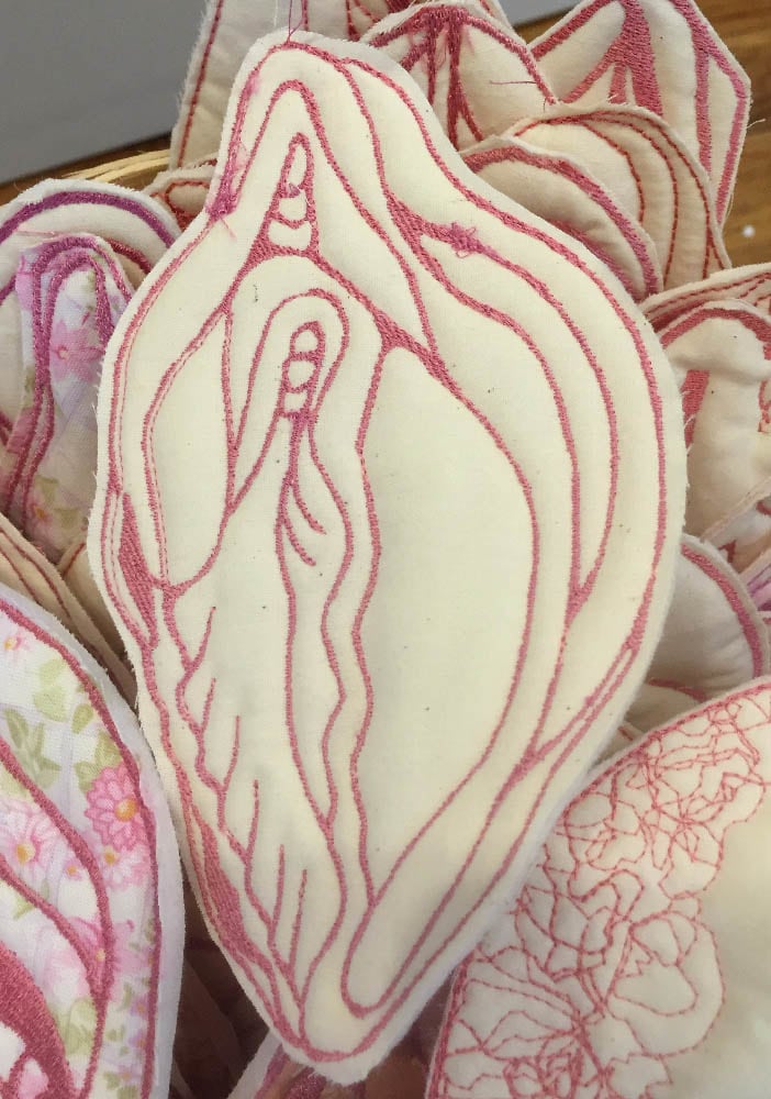I am now, officially, an older artist and far less embarrassed. My issues are the feminist issues of power, gender and ageism. As with all body parts, vulvas age, but they remain silly, sexy and life giving. When I began to accumulate these trapunto vulvar objects, they made me giggle. And why not? It is a garden of vulva/shells, shuffling for space, in all shapes and configurations. In Grandmother's calicos and respectable muslin, they compete to be seen. It's a party! In a cheese box! And, why not?