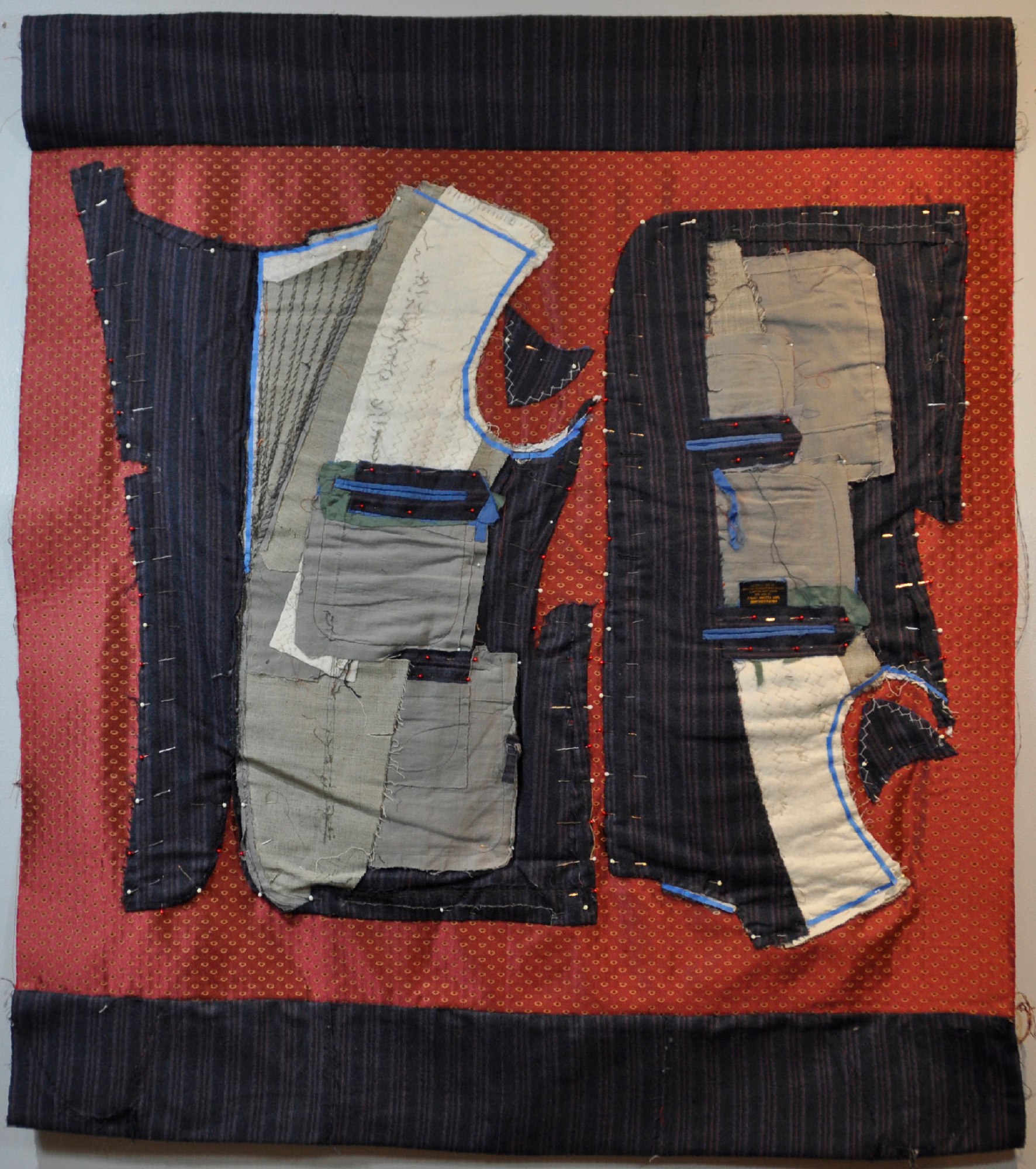 Deconstructing Power is a series of stitched assemblages that consider the artificiality of the power suit, designed to enhance male images of power. The deconstructed suits are stitched onto floral/feminine upholstery fabrics with their artifice prominent.