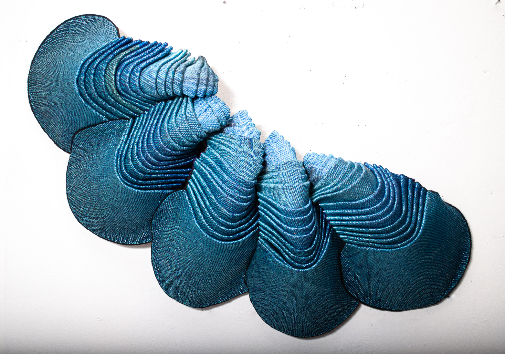 One afternoon, I started playing with what the embroidery looked like folded. Soon, it became obviously articulated, like a crustacean. It was interesting to see the tensions in play between the soft vertical folds and the resistant curve in on itself. It was also interesting to see the subtle color shifts brought about by changing the color of the substrate from white, to grey, to deep purple.