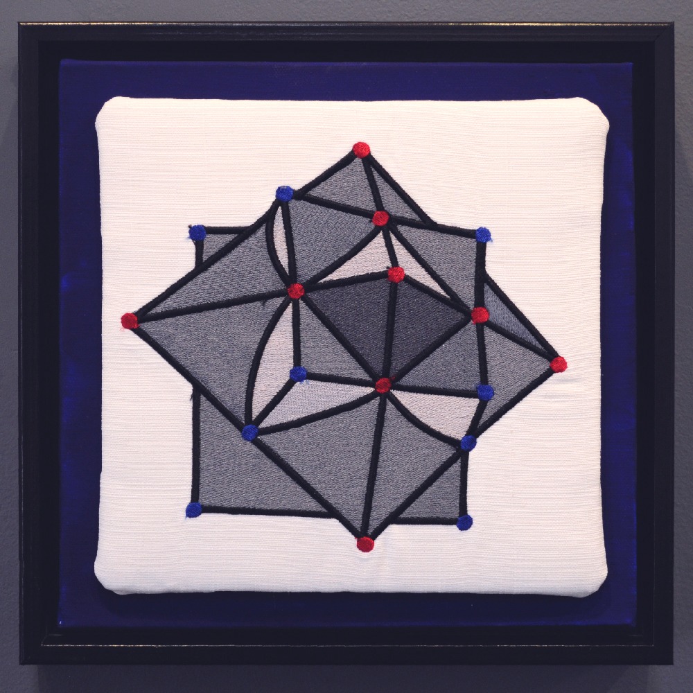 The geometry of thread is compelling in both fact and metaphor. Sewn or embroidered thread is analogous to a line connecting two points in geometry. No matter how the eye sees a composition, each stitch is a straight line. This one is ambiguous, careening across two and three dimensional. See if you can make it settle down in space!