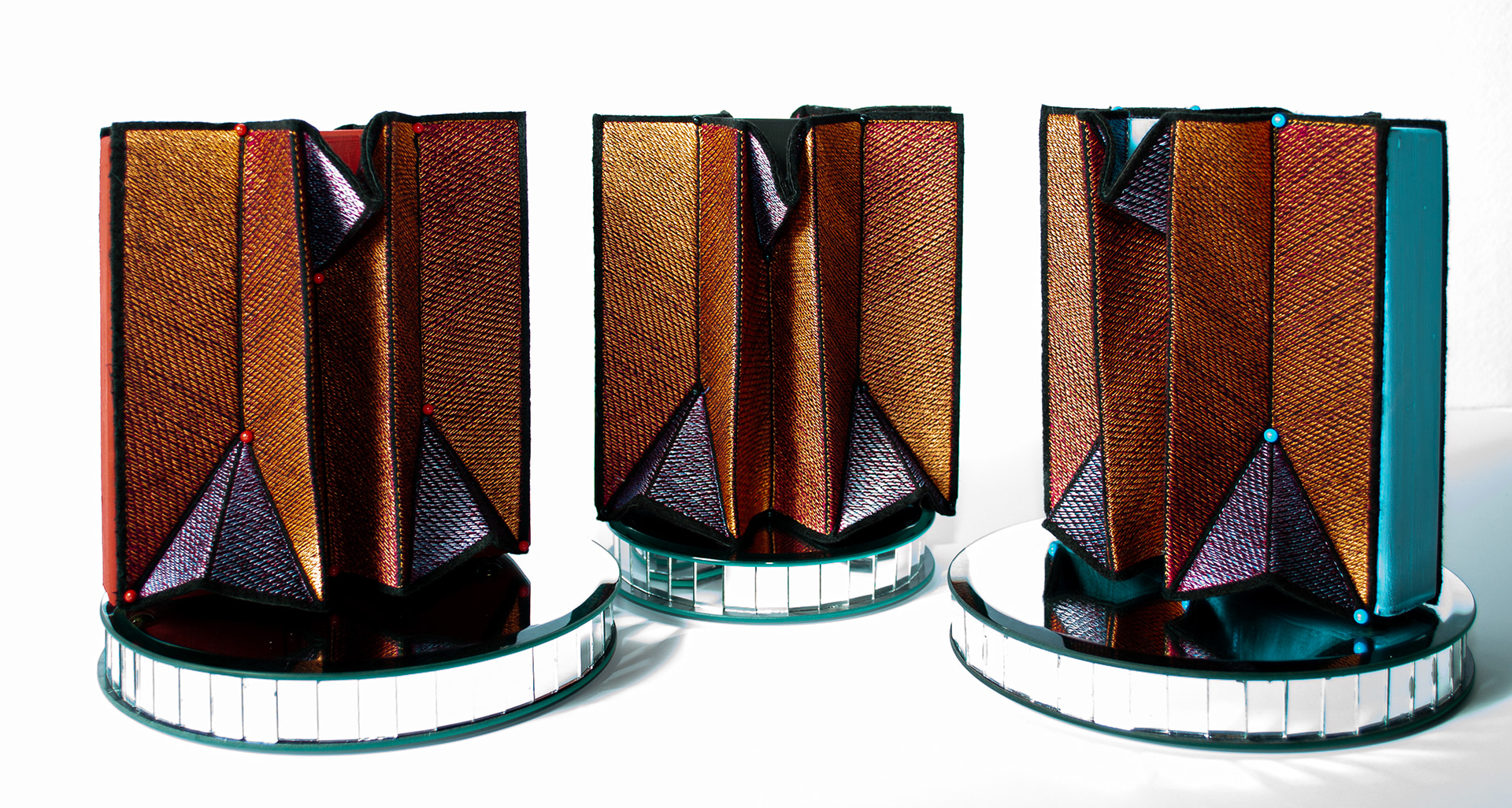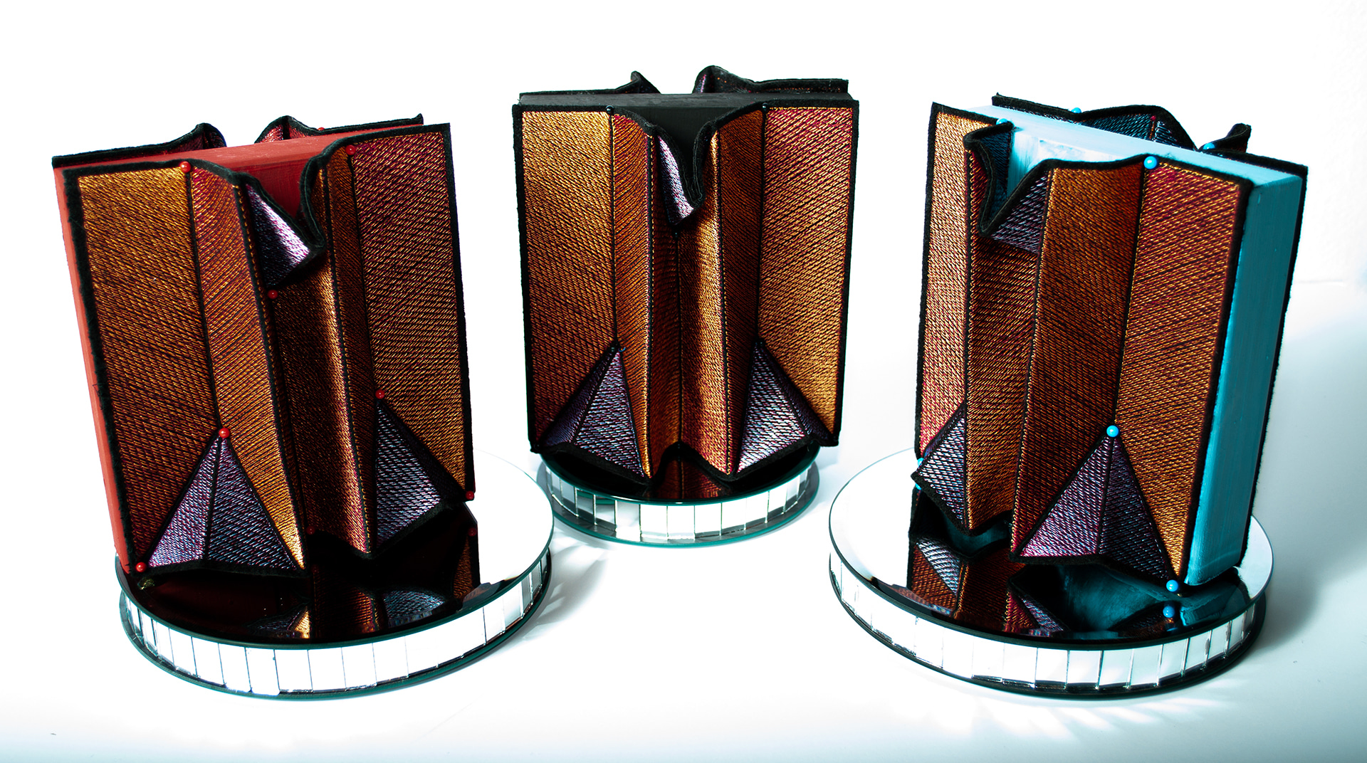 It all began as a reflection upon accordion and pop-up books and, of course, color. I do truly love the color capabilities of commercial embroidery thread! It reflects and bends light rather like a prism. Since all color is simply reflected light, if you change the angle of the reflection, you change the color. But I am also passionately devoted to sculptural form, drawing on my background in sculpture and bookarts. And then there is the matter of the mirrors and their multiplier effect!