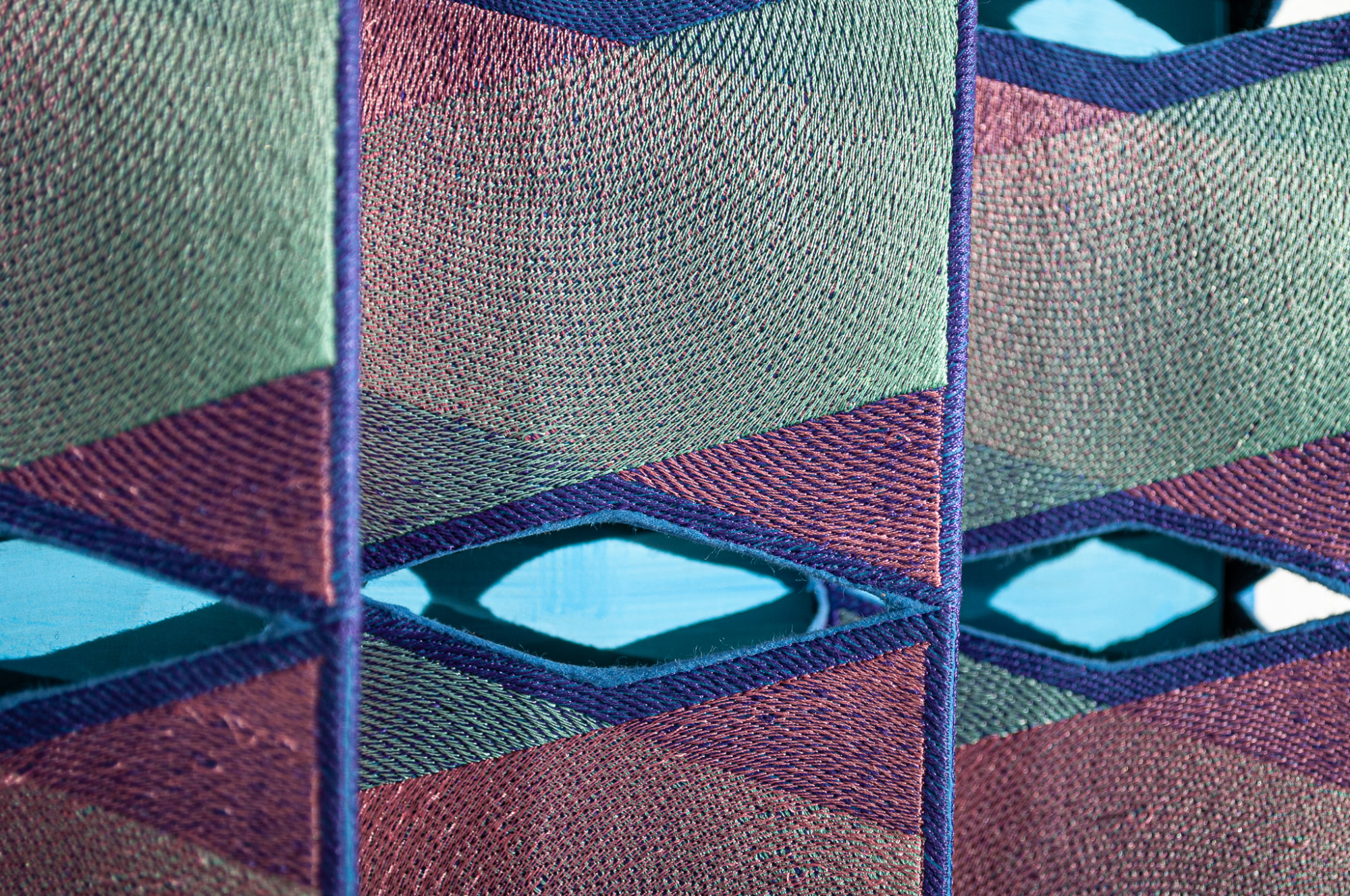 Playing with sweet colors for a change! When I started bending the forms, they called for cut-outs. When the cut-outs cast their shadows, a different feeling began to develop looking at the piece. The cut-out and their shadows as well as passthroughs confused the visual cortex of my brain. I began to feel as though I was being watched!