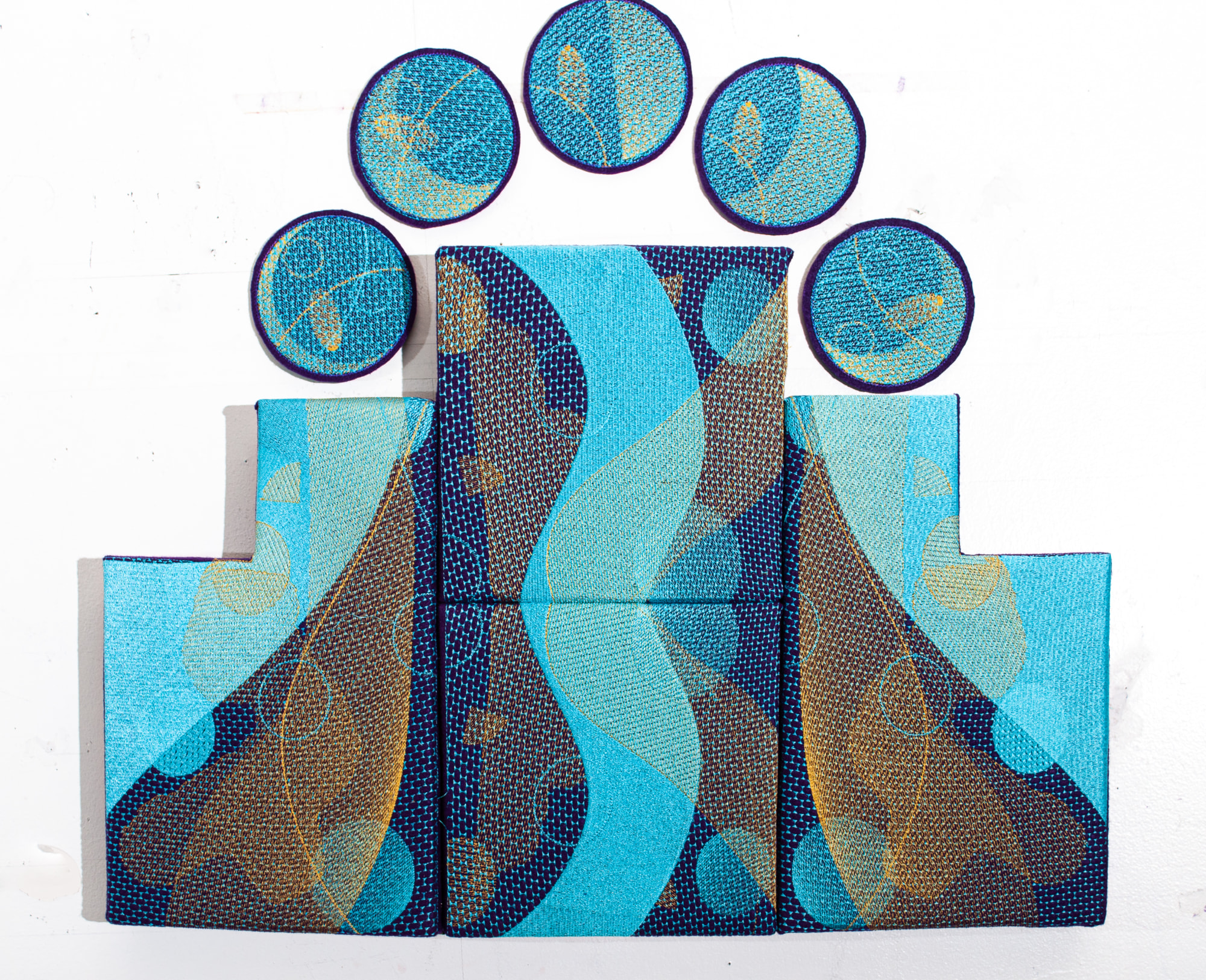 Lunar position and solar winds interact to form high tides—and perhaps a few market shifts along the way. Solar Tide traces this push and pull between cosmic forces and earthly consequence. The embroidery undulates like liquid light, its stepped panels recalling tidal terraces or rising flood lines. The artwork transforms data-like pattern into something bodily and alive, a visual current that merges scientific observation with quiet prophecy. Both luminous and cautionary, the work reflects on our place within systems far larger than ourselves—reminding us that every tide, whether oceanic or cultural, eventually comes in.