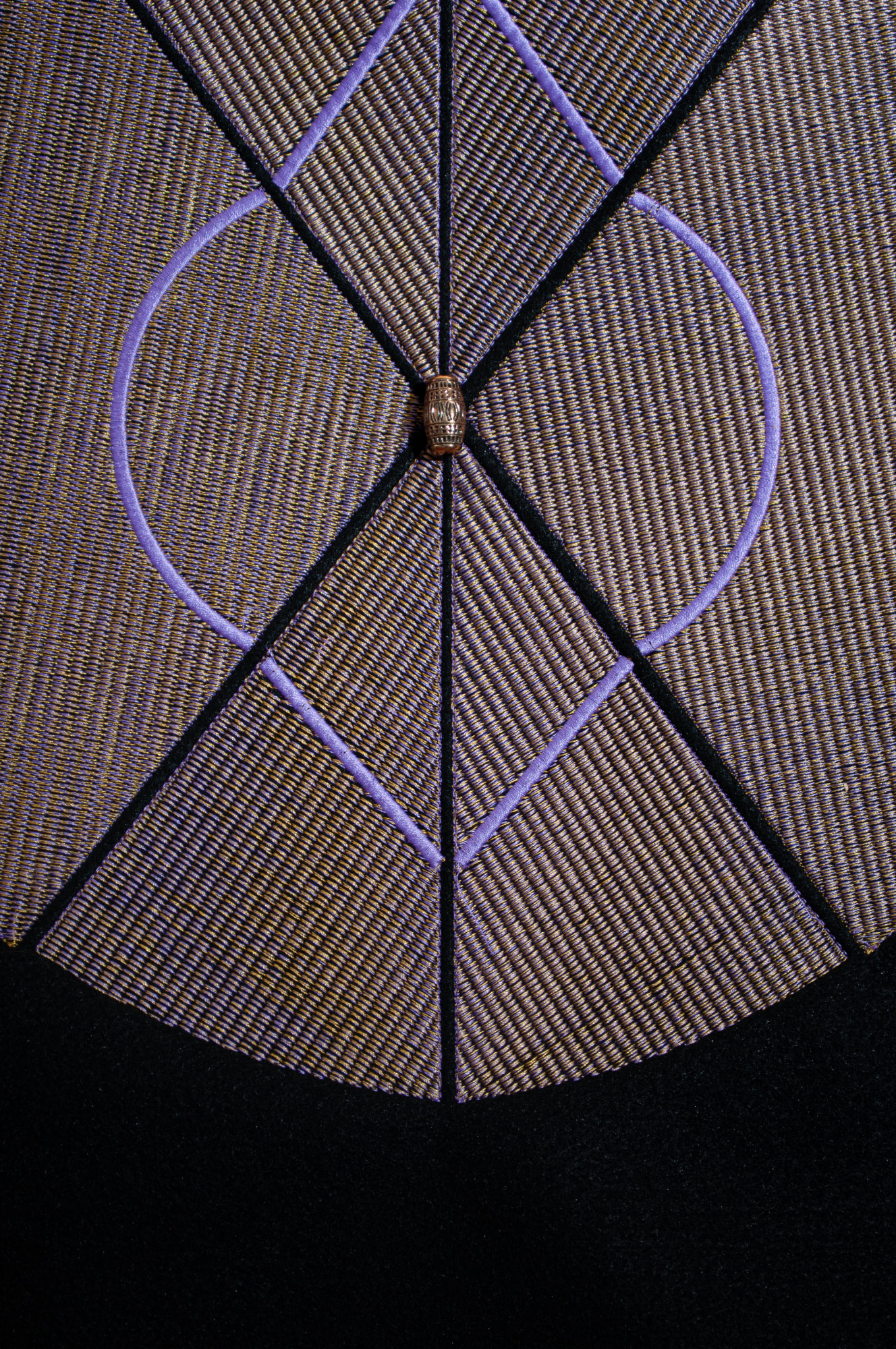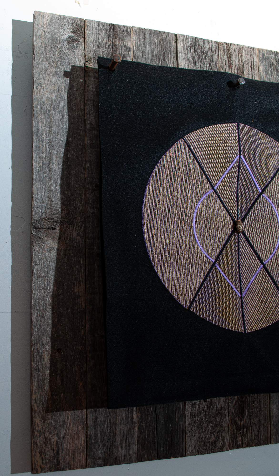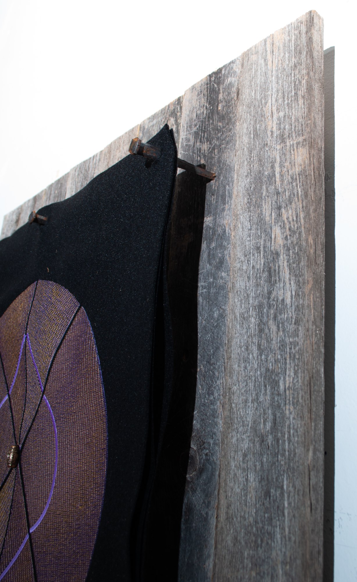 A curious piece, made intuitively. I stitched 2 of these shapes in pale lavender and gold on 2 layers of black felt. One of the forms was folded into a module for another sculpture. But this flat piece kept niggling at me. I left it in the hoop for a long time. Finally I put it up on the wall and it "spoke!" Barnwood and rusty spikes were needed to elevate this piece to visionary status.