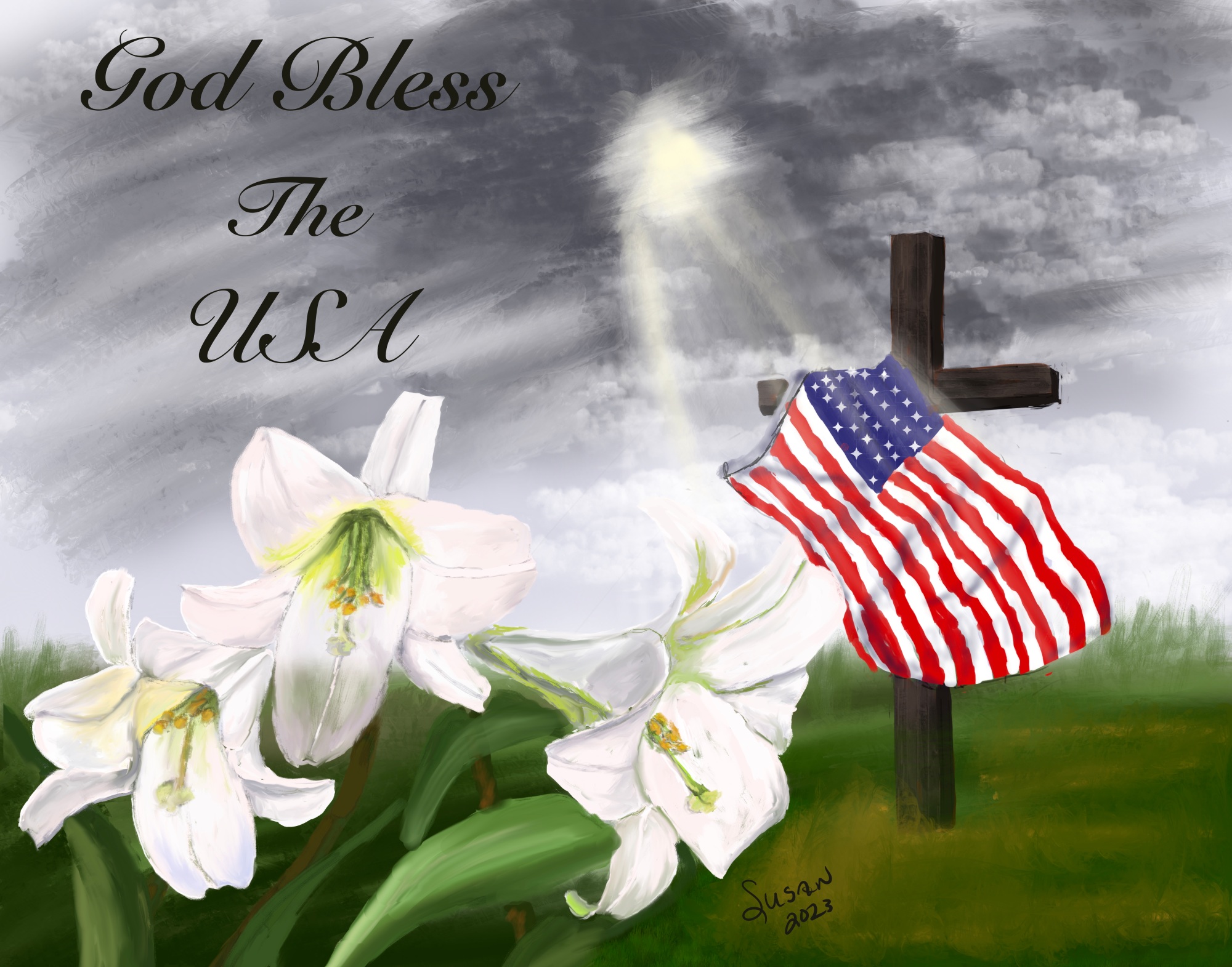 Flag draped cross with white lilies in foreground