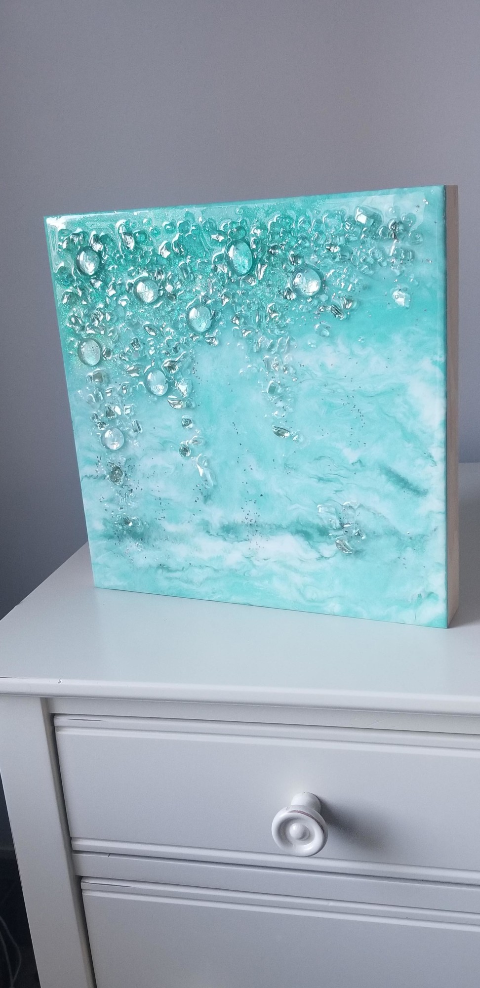 The perfect accent piece to add some color, a popular seafoam & mint green with white lacing & metallic mint green resin to contrast.