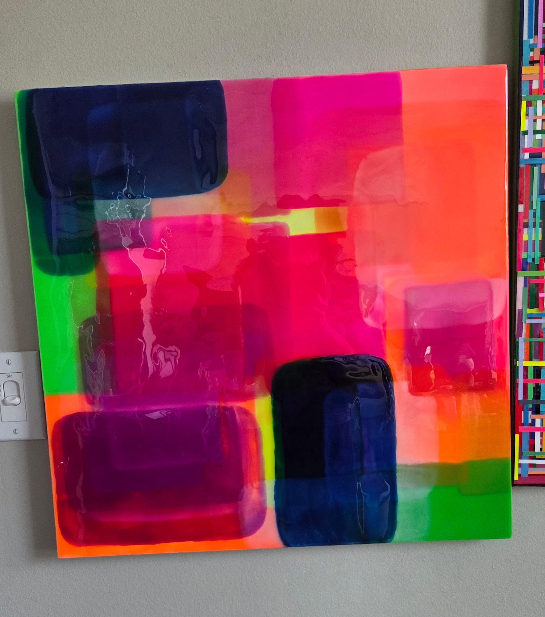Created by me. This is a beautiful abstract resin art piece created with the brightest and richest pigments mixed with resin to create the glass finished look. This is made with all the highest grade professional products and will not fade or lose their rich color.