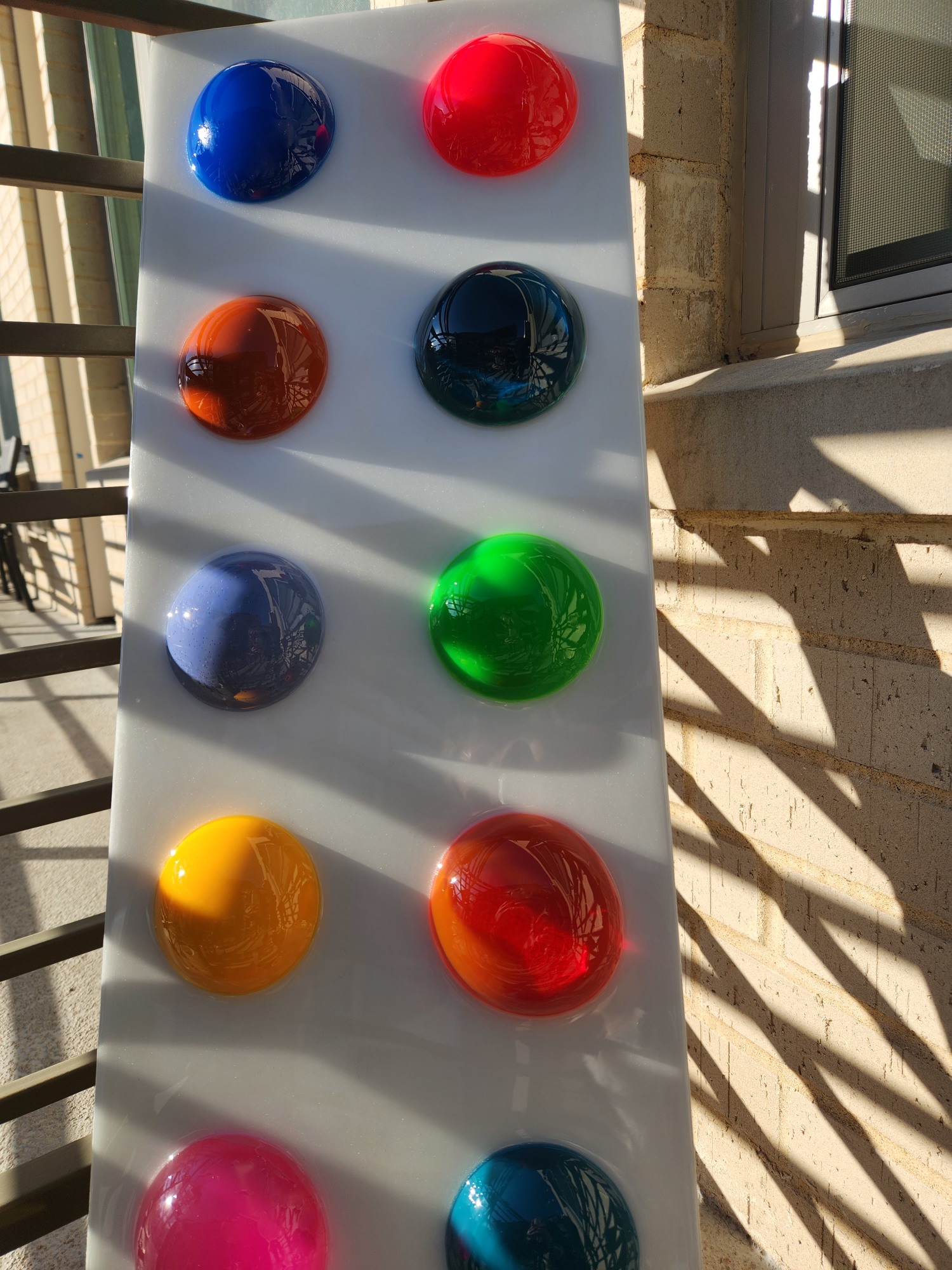 Colorful Spheres made individually using bright, bold, resin pastes to really draw attention to this fun piece of art. The spheres are then placed randomly in pairs on a wooden substrate with a hint of ivory pearl as the background. It's a head turner & very unique.