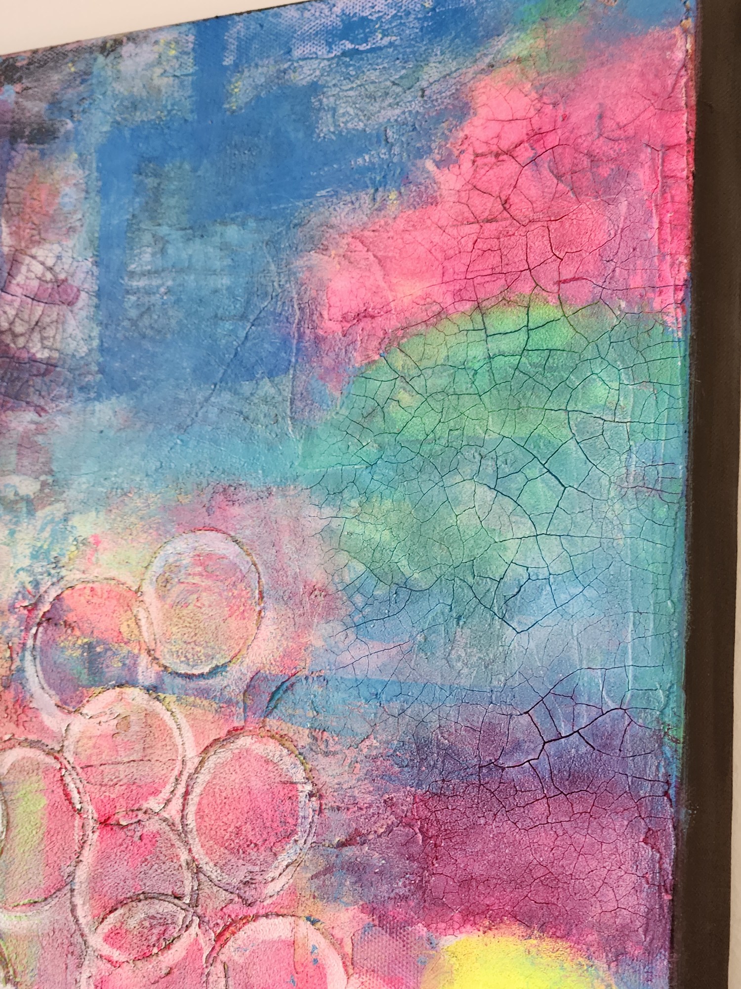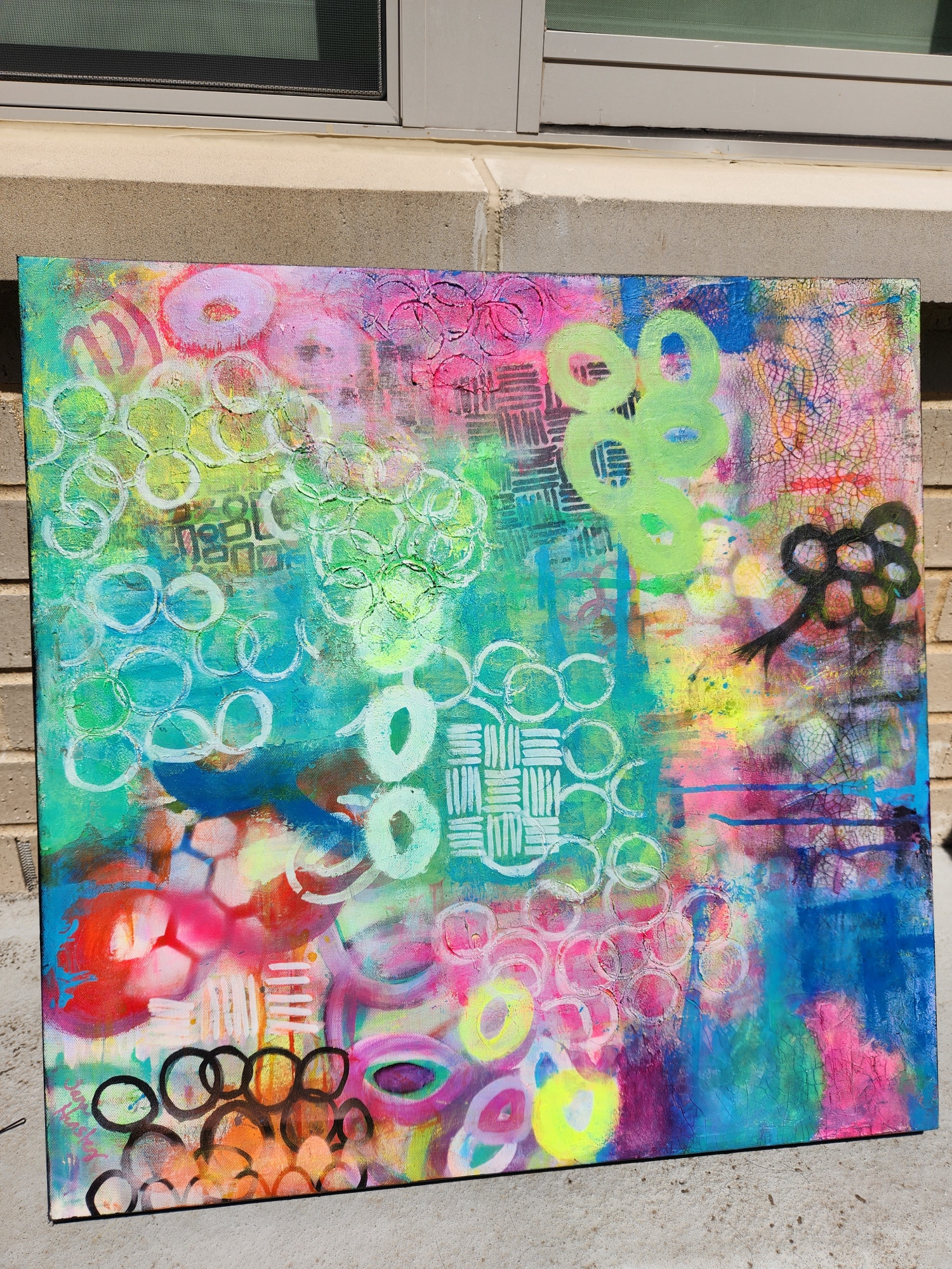 Super fun graffiti artwork, created on stretched canvas adhered to a Gallery Profile MDF Substrate using various mixed media, crackle pastes, molding pastes, fiber pastes, Inks, Acrylics, and Spray paints. I absolutely love the colors for this piece, I used the brightest, neon pinks, oranges, yellows, and highly pigmented blue matte, red matte, and yellow matte, with fun greens, lavenders, and just about any color in those families.
