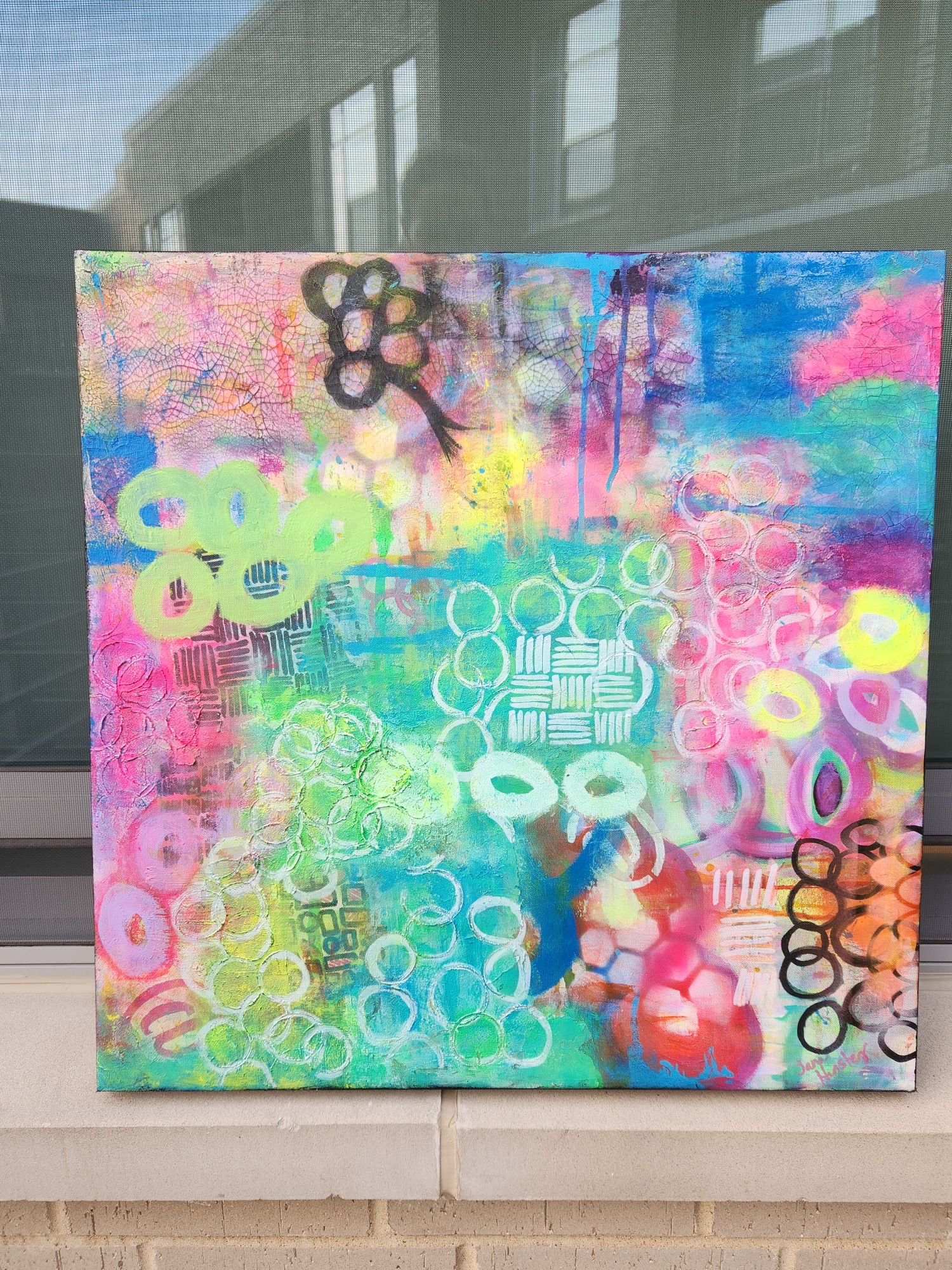 Super fun graffiti artwork, created on stretched canvas adhered to a Gallery Profile MDF Substrate using various mixed media, crackle pastes, molding pastes, fiber pastes, Inks, Acrylics, and Spray paints. I absolutely love the colors for this piece, I used the brightest, neon pinks, oranges, yellows, and highly pigmented blue matte, red matte, and yellow matte, with fun greens, lavenders, and just about any color in those families.