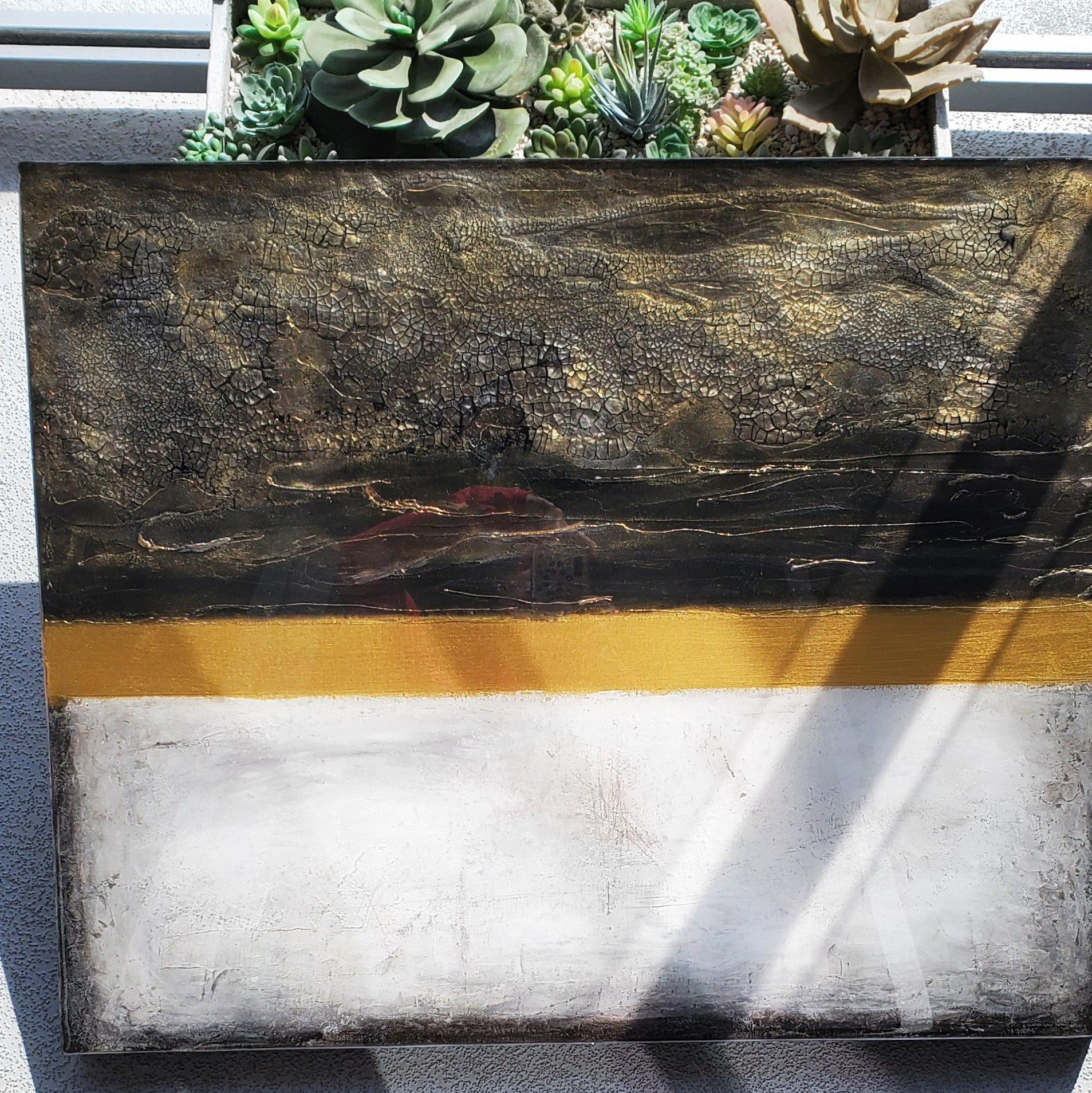 I've made a piece similar to this one but sold it immediately, and it was so fun to make I decided to make a second one a little bigger. 30x24x1.5 inch gallery cradled profile wood panel. And created the texture from layers upon layers of crackle pastes and crackle grounds, modeling paste, Fibre pastes, acrylics, inks, gilding wax in gold and silver and polishing certain random parts with both giving a gunmetal sheen to the crackled areas.