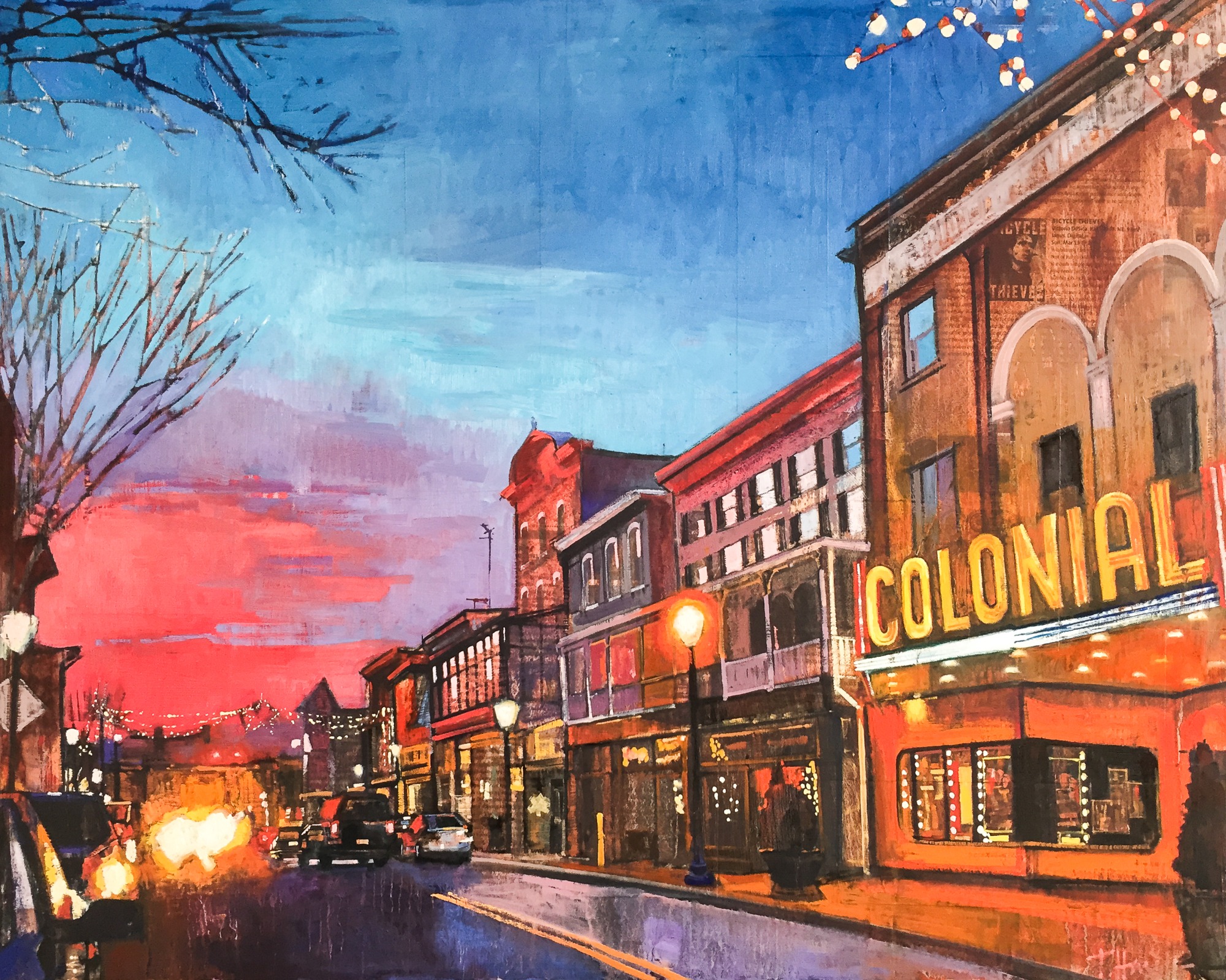 Bridge Street in Phoenixville looking west. Reference photo shot by Beth Lennon. Taken the night of the Christmas Parade, 2015.