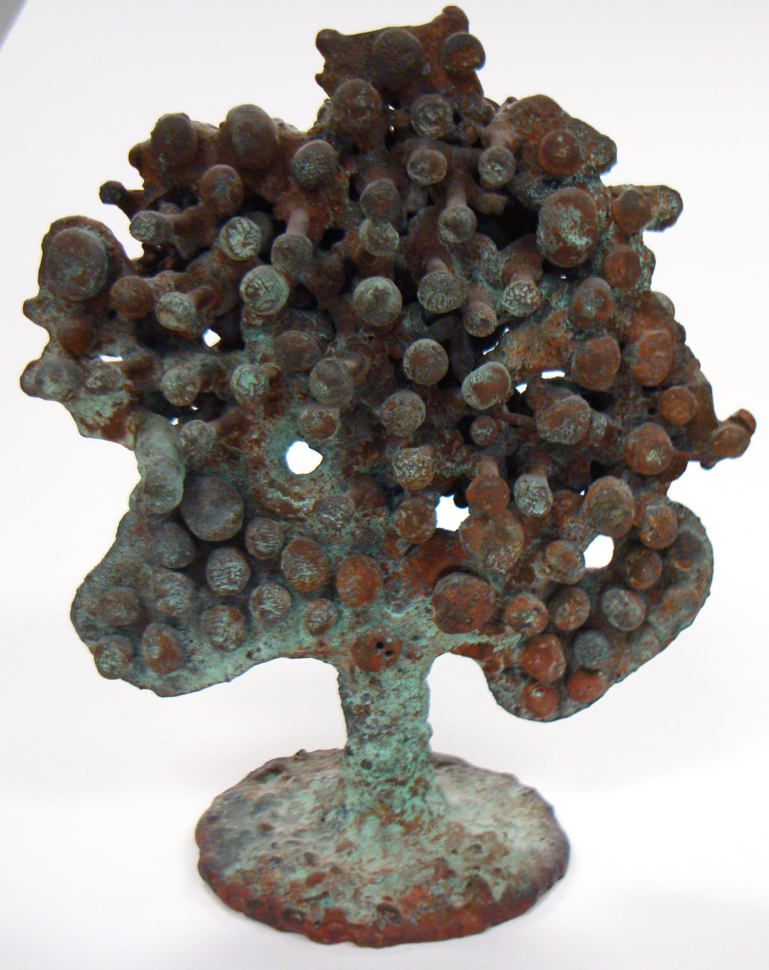 MessageThis small sculptural work by Klaus Ihlenfeld depicts an apple tree with a round base, trunk, and branches full of fruit. The work blends natural and industrial forms, and uses corrosion and patina as expressive elements. It invites reflection on resilience, the passage of time, and the intersection of organic life with material degradation. The artist studied under Harry Bertoia.