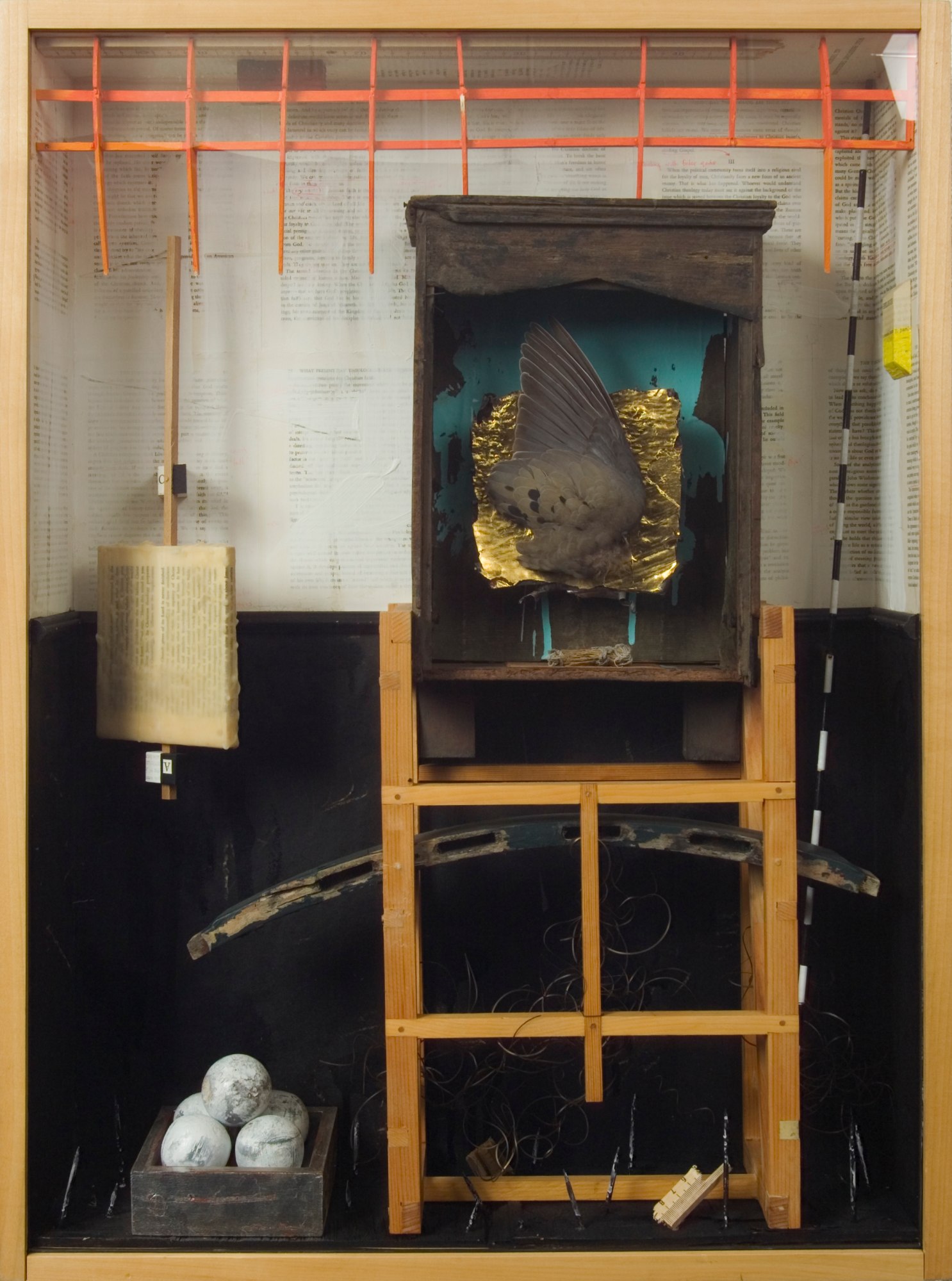 Donald Forsythe based the assemblage For Those Who Wait on his experience of meeting Christian artists in Guatemala and attempting to understand their lives and faith perspective. The central wooden shrine once held figures of saints for a household altar and now contains a bird’s wing set against a gold metal panel and teal backdrop. An orange grid at the top suggests order or containment, and the wax-encased text on the left hints at obscured narratives or protected knowledge. The wooden scaffold-like structure and the tray of circular forms reinforce ideas of support. The background of printed text pages layers the piece with a sense of history and storytelling.