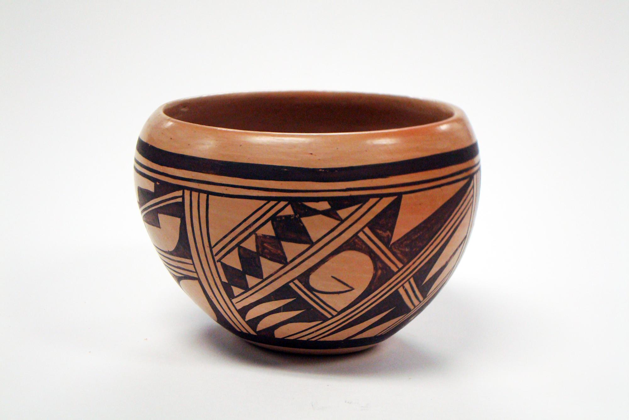 MessageThis bowl comes from the Hopi nation in Arizona. Hopi ceramics are unique for their ability to change color in the firing process. Gray clay produces yellow/tan wares (as seen in this vessel), and yellow clay produces red wares. Hopi pottery is also characterized by natural designs such as wildlife and plant life, as well as symbols. In this vessel, the black painted natural designs cover the exterior of the bowl. The bottom of the bowl is signed "B. Mahn, Hopi, First Village ..." revealing the artist and the nation in which is came from.