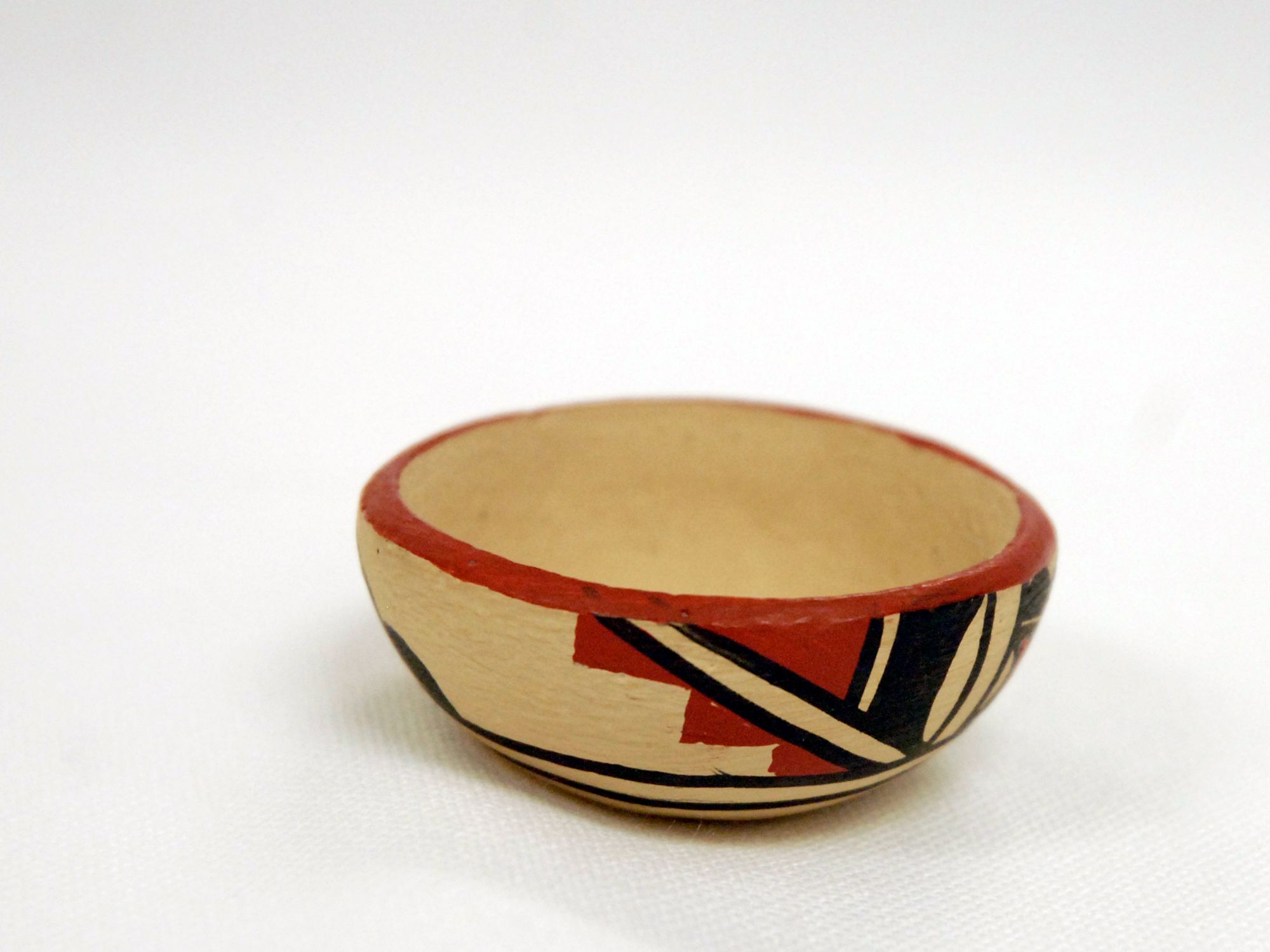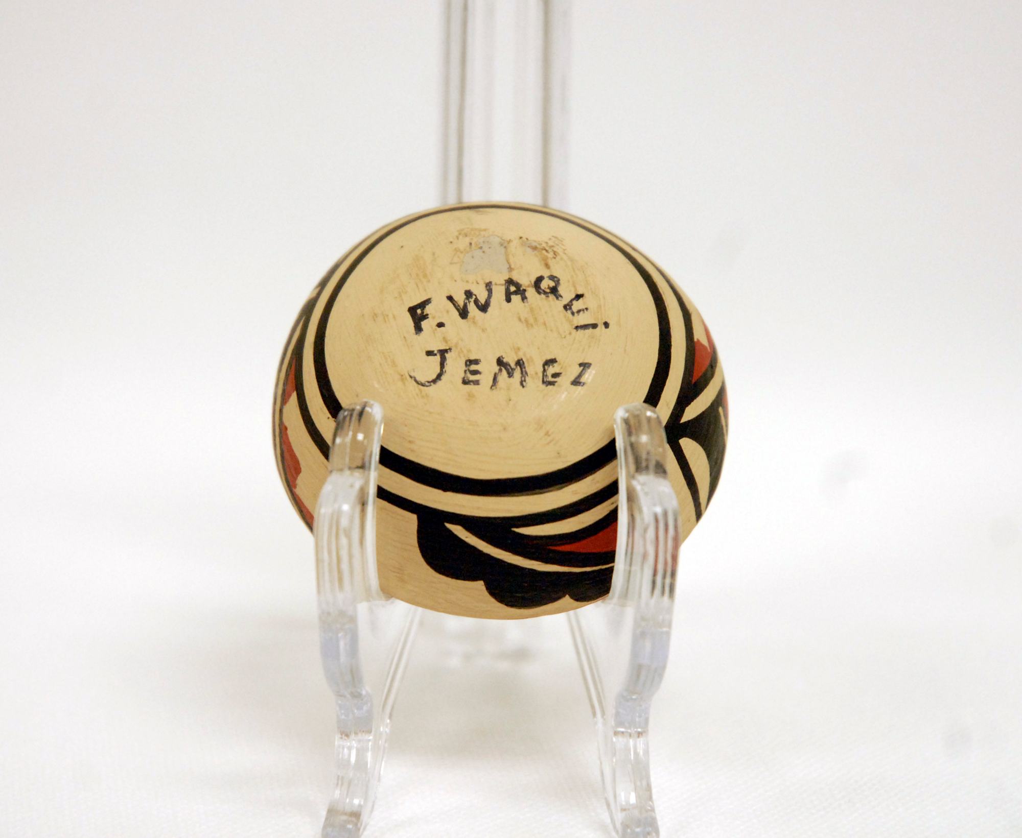 MessageThis small bowl comes from the Jemez nation in new Mexico. Jemez ceramics are unique in the sense that they are all mostly from contemporary artists. The Jemez ceased ceramic production in the eighteenth century and ceramic consumerism existed solely through trade with other nations. In the late twentieth century, the Jemez started producing their own original ceramics again. Classified by their red, tan, and black pigments as well as their natural design, Jemez pottery is quite unique. This vessel displays all the traditional characteristics of Jemez pottery, from the coloring to the designs on the exterior. The bottom of the vessel is signed "F. Waqui, Jemez" giving the artist's name and nation.