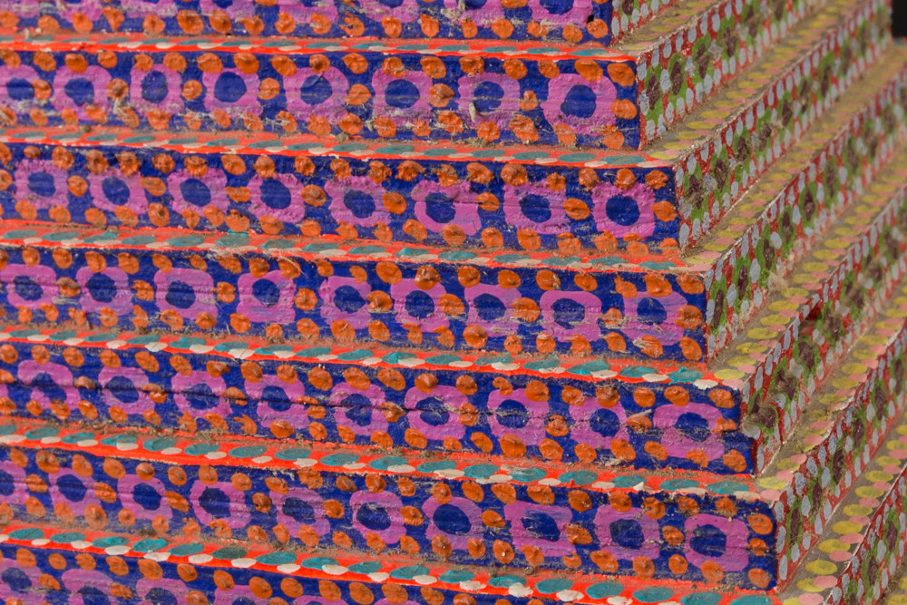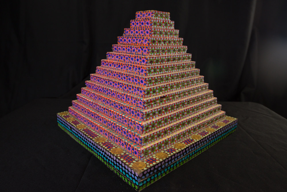 Wood sculpture with dot design in multiple colors.