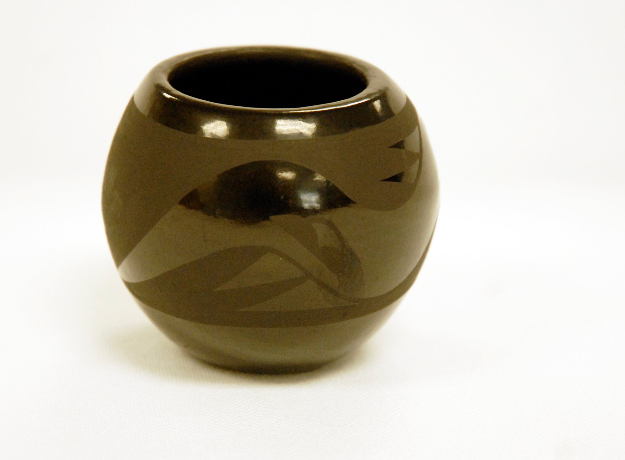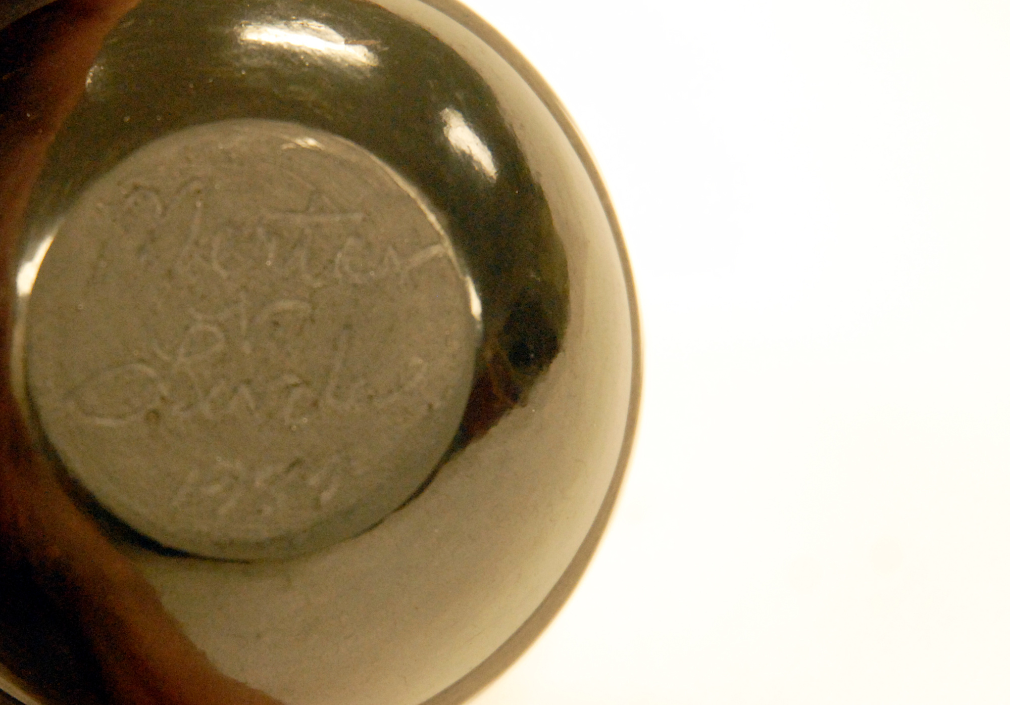 This bowl comes from the Santa Clara nation in New Mexico. The Santa Clara are known for their polished black ceramics, such as this vessel. The designs are normally carved into the clay or incised on the surface. In the case of this vessel, the matte black designs offset the polished black exterior. The bottom of this vessel is signed "Mertes V. Linda" giving the artist's name.