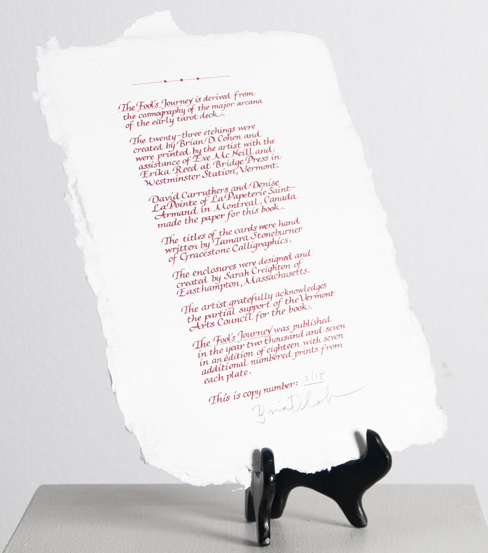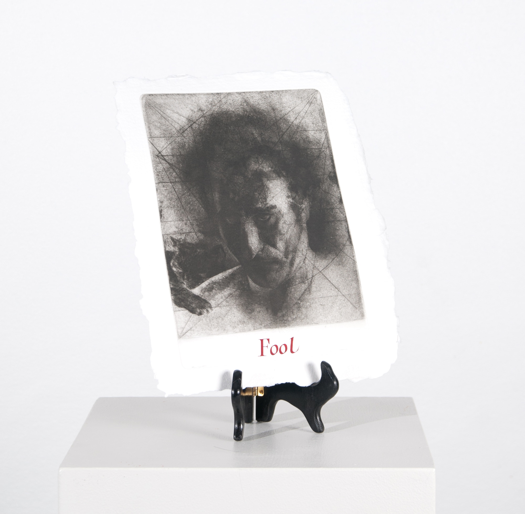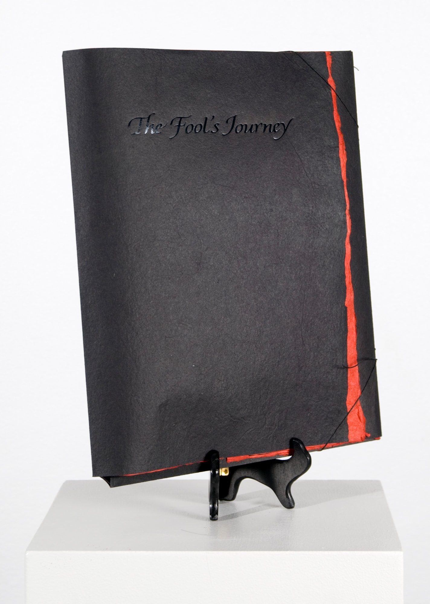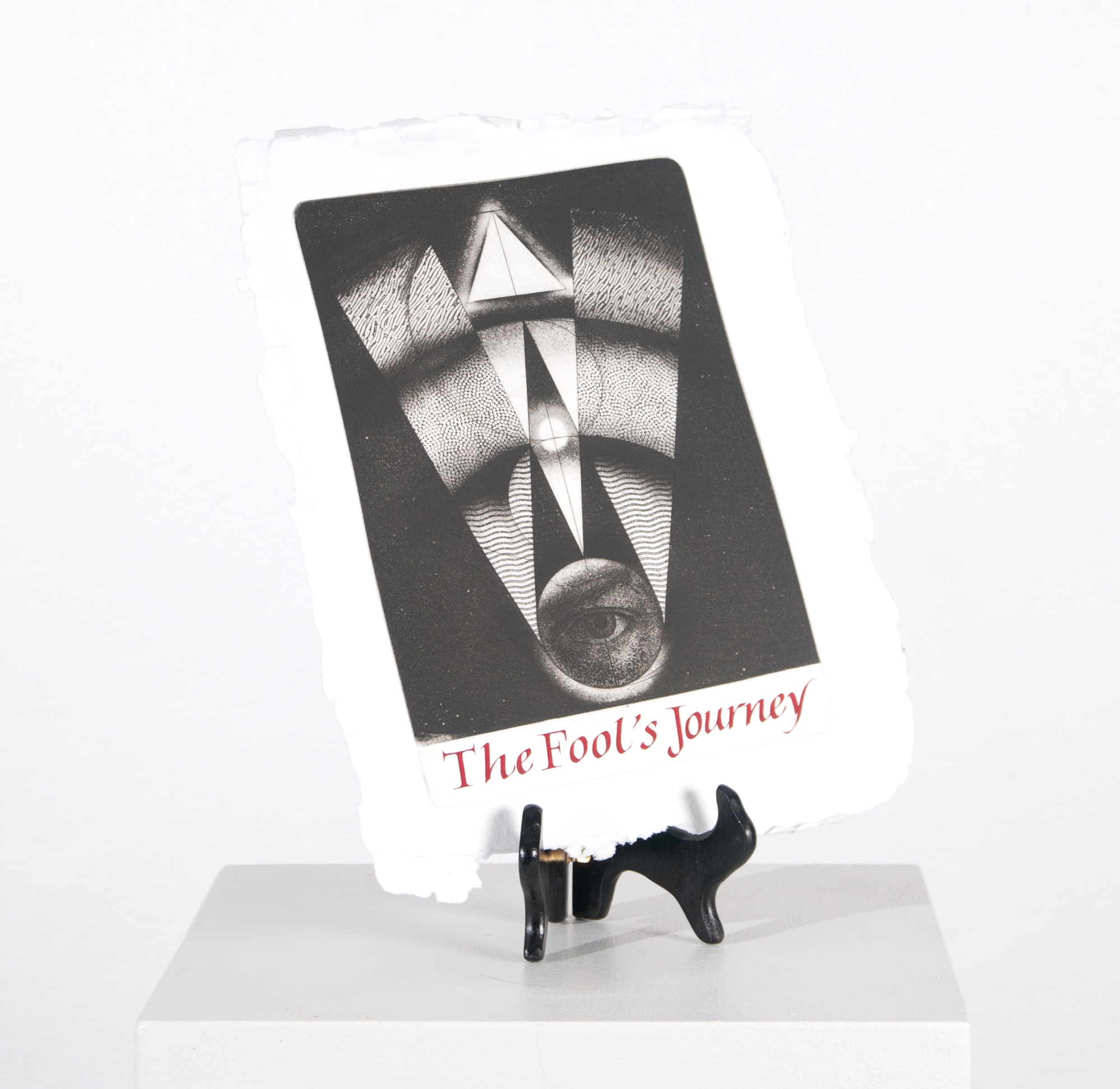 Message"The Fool's Journey" is a book of twenty-three etchings modeled on the major arcana of the traditional tarot deck. the tarot originated in the Renaissance as a form of cosmography, a visual illustration of a philosophical world-view. Each card presents an archetype of human experience illuminated through a parallel, symbolic element or quality of the physical world. The progression of cards in sequence represents a journey of discovery , awareness, and insight, from the blindness of the Fool (number 0) to the spiritual illumination of the World (number 21). To view more pages, contact The Gallery at Penn College.