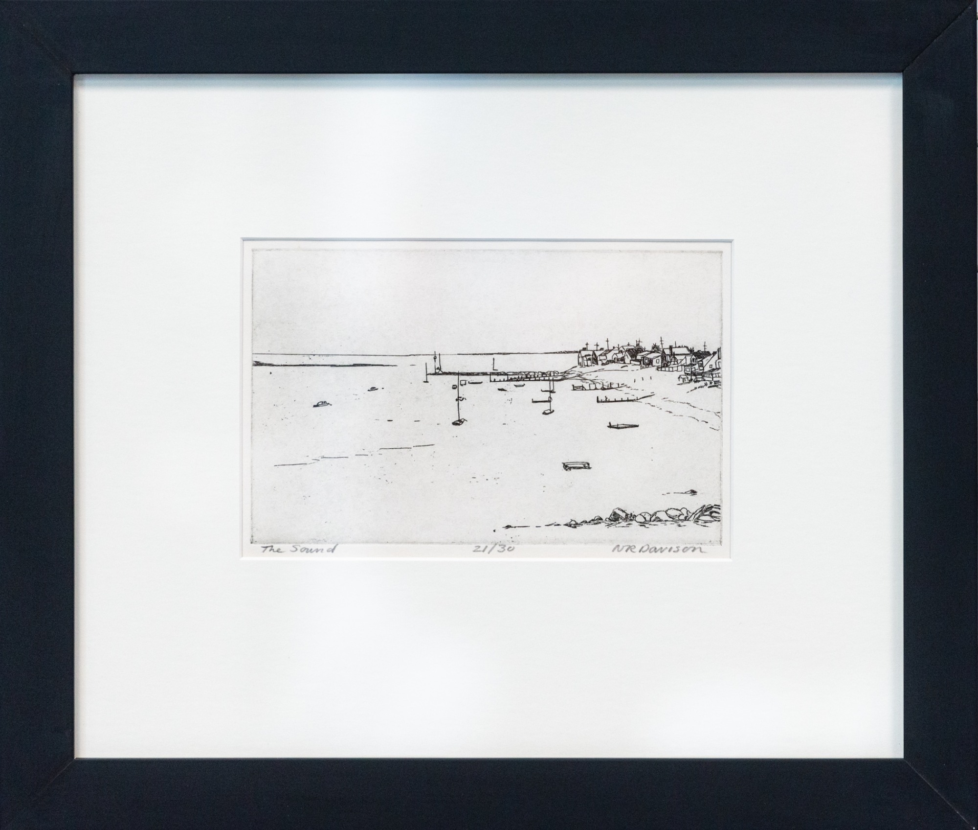 MessageAquatint etching of water scene, with shore and houses on right.