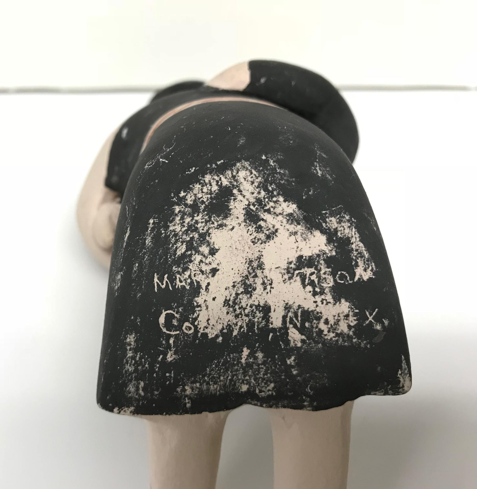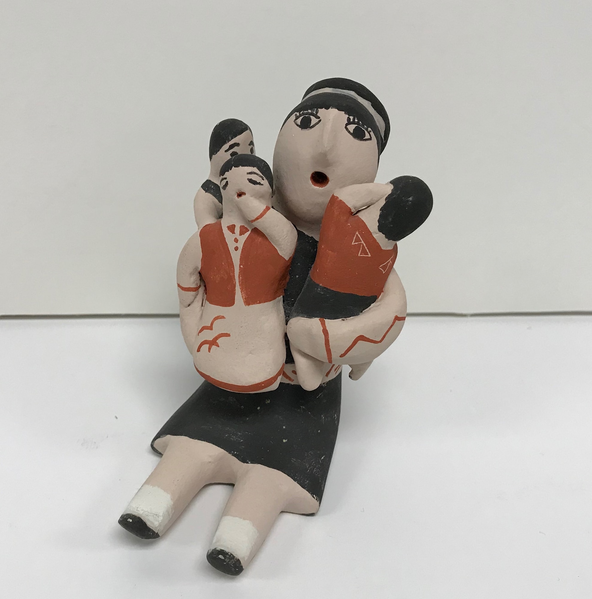 MessageThis sculptural work was sourced from the Jemez tribe in New Mexico. The Jemez ceased all their pottery making in the mid 18th century, and sourced their pottery from trade with neighboring tribes. However, beginning in the 1960's, there was an increase of desire towards Native American art that sparked making habits back into the Jemez tribe. By the 1980's, traditional Jemez pottery had picked back up. Most Jemez pottery is colored red, but they are also known to paint in beige and black pigments over their red colored clay. In this particular sculpture, a mother holds three children in her lap. She is painted using the black and beige pigments, while also featuring traditional red pigments as well. The figure's origin is unknown, while it does closely resemble the Jemez storyteller figure. This figure represents the importance of passing down stories and culture orally in various Native American societies. There is a signature on the bottom that is hard to read, but may say "Mary Henderson."