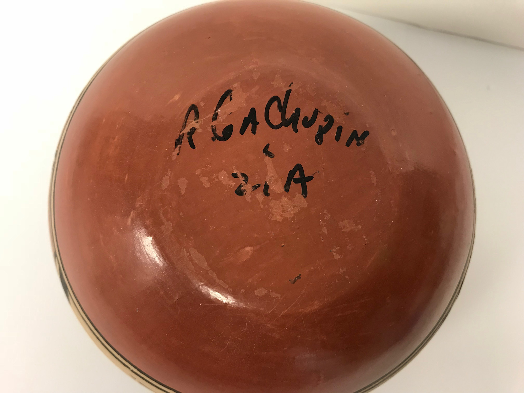 MessageThis vessel is sourced from the Zia tribe in New Mexico. The Zia have been known for their distinctive pottery for hundreds of years. The type of clay sourced in the Zia Pueblo is granular, creating thick and sturdy clay wares as opposed to other pueblo's thin walls and delicate wares. The Zia use a variety of symbols in their works, the most common being their tribal bird; a roadrunner. When New Mexico became a state, they sourced many symbols from the Zia such as the roadrunner, which became the state bird, and the sun symbol, which is featured on the New Mexico flag. The Zia use brick red clay and then paint on pigments of a creamy white and a dark brown for contrast. This particular vessel is painted with a red-brown pigment along with the white and dark brown characteristic of the Zia. This vessel features the roadrunner, the classical Zia symbol, central on the front and back. The signature on the bottom is unclear, but may spell out "R. Gachupin, Zia."