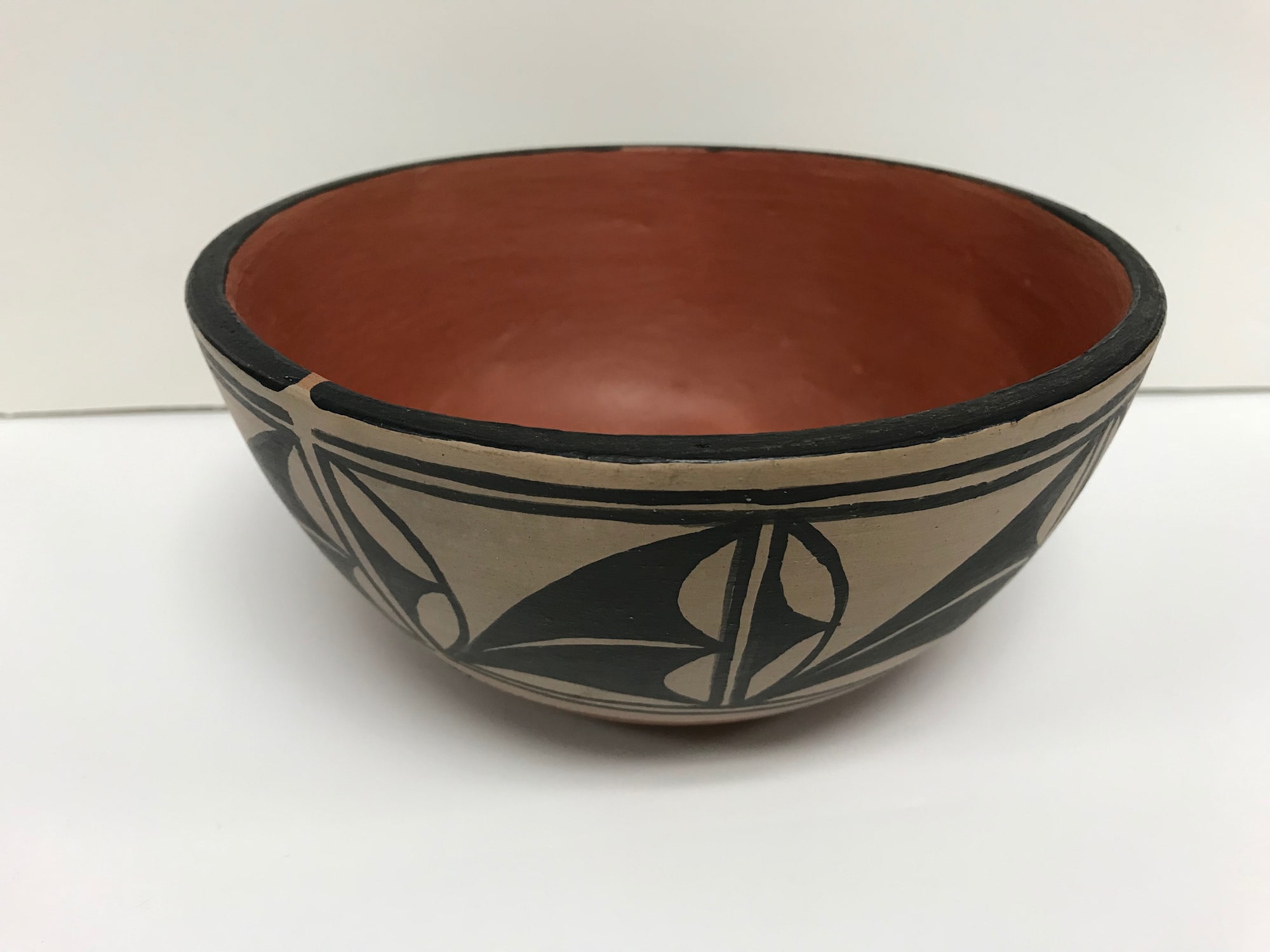 This vessel comes from the Santo Domingo tribe in New Mexico. The ware is consistent with other tribal ceramics from surrounding areas, for example, the colors are similar to those seen in Jemez ceramics. The artist, Alvina Garcia, has been creating pottery using classic Santo Domingo methods since the 1970's. This includes using vegetal or mineral paints on the locally sourced clay. In this particular vessel, the exterior is painted in a creamy white and black natural design, and the bottom and interior remain a terra cotta red. The bottom is signed "Alvina Garcia, Santo Domingo, N.M."