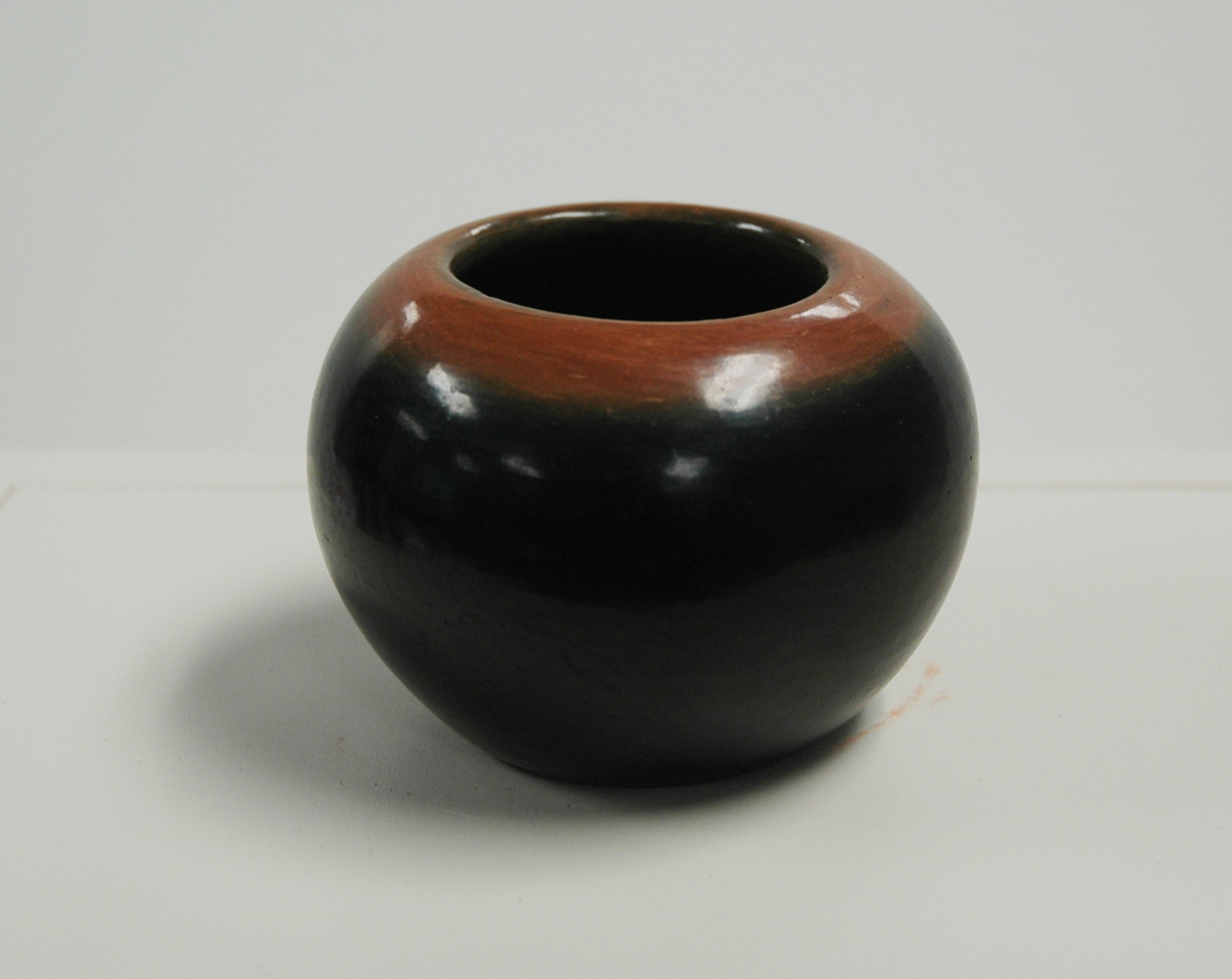 This pot comes from the San Ildefonso Pueblo in New Mexico. This pot is a typical vessel of the San Ildefonso, characteristic of the black shiny exterior that both San Ildefonso and Santa Clara share. This artist, Juan Tafoya, was a friend of the donor and has several pieces in the gallery's collection. The donor also mentions that San Ildefonso is unique in its ability to produce black and brown pots, and pots using both colors, by mixing the colors during the firing process. That process can be seen in the rim of this pot, bearing both brown and black pigments. The base is signed "Juan Tafoya, San Ildefonso Pueblo, 1993."