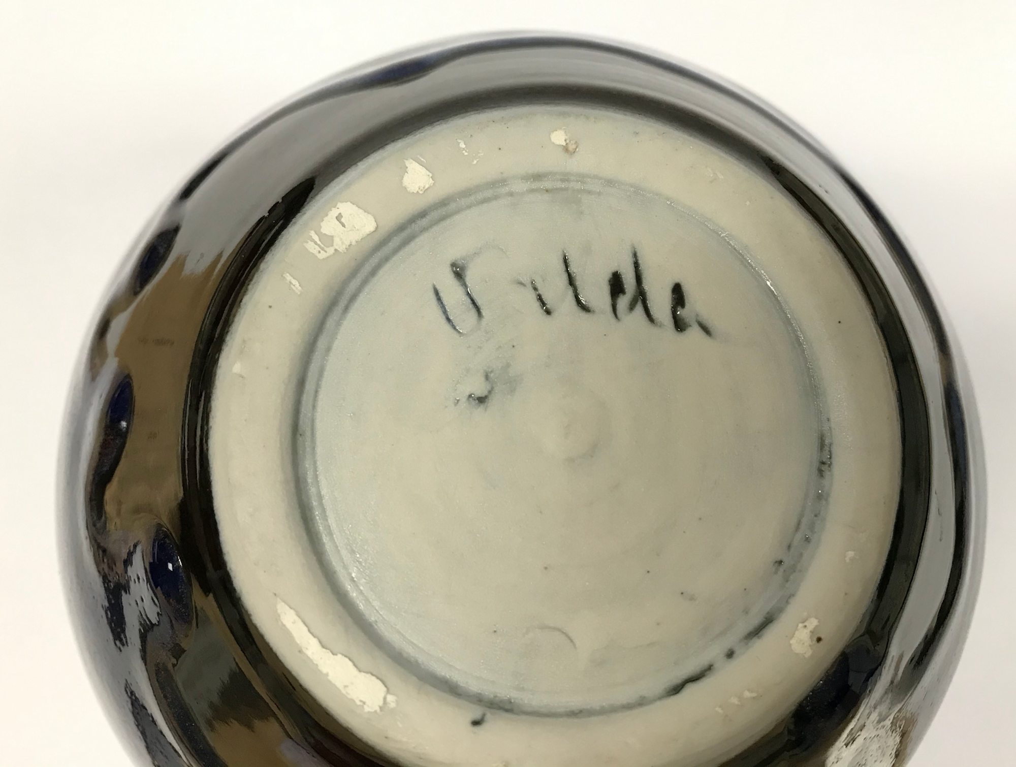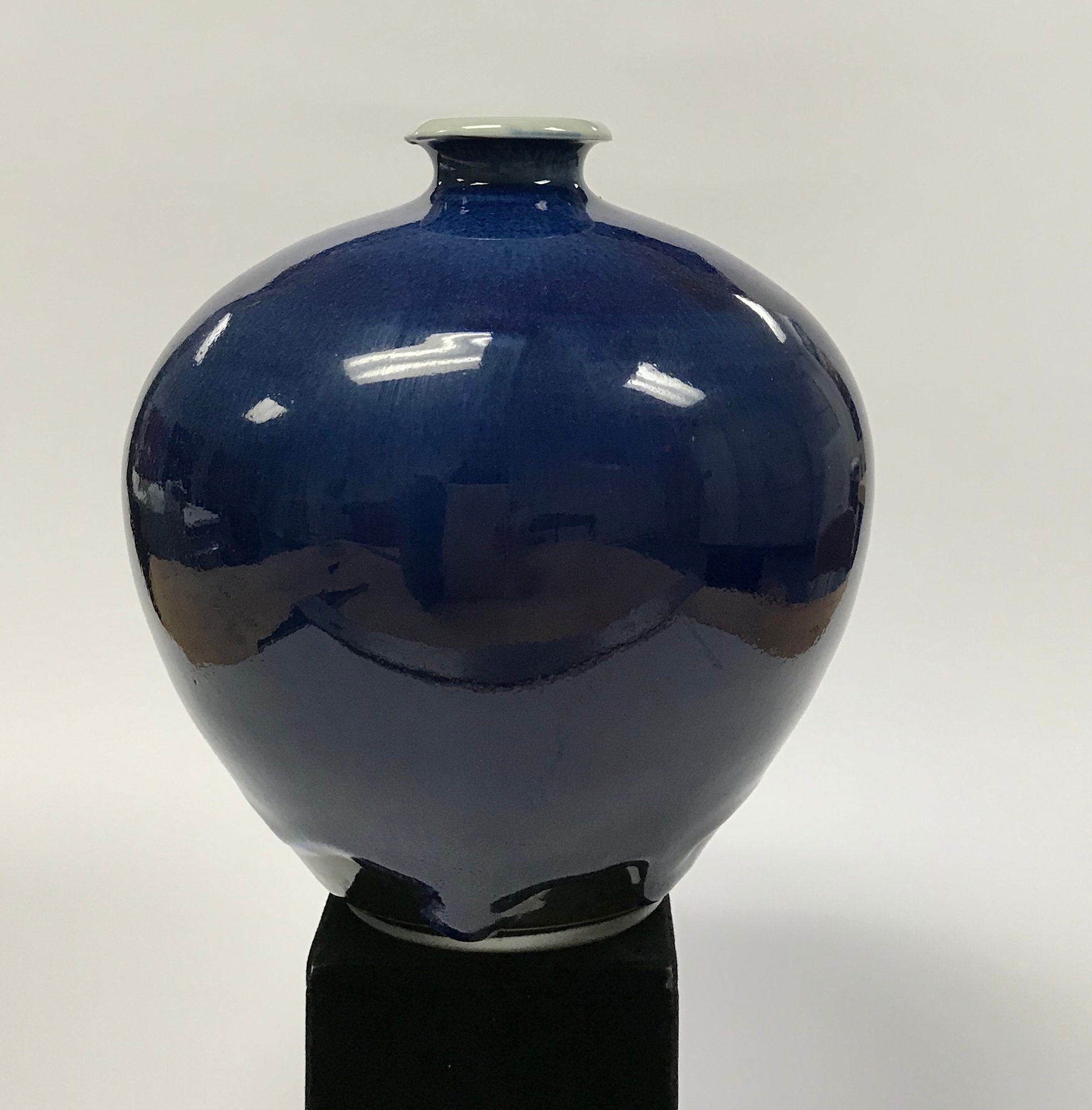 MessageThis beautiful blue ceramic vase is made by artist Valda Cox. Cox is a native of Riga, Latvia, and has been a full time potter for over 40 years. Her main expertise lies in porcelain. She is known for the depth and brilliance of the colors in her glazes. This particular vase has a large belly, and a very short, round neck. The belly of the vase is is sculpted upwards in an oblong shape. The color is a deep, rich blue with a white base. The base contains the artist's first name as a signature.