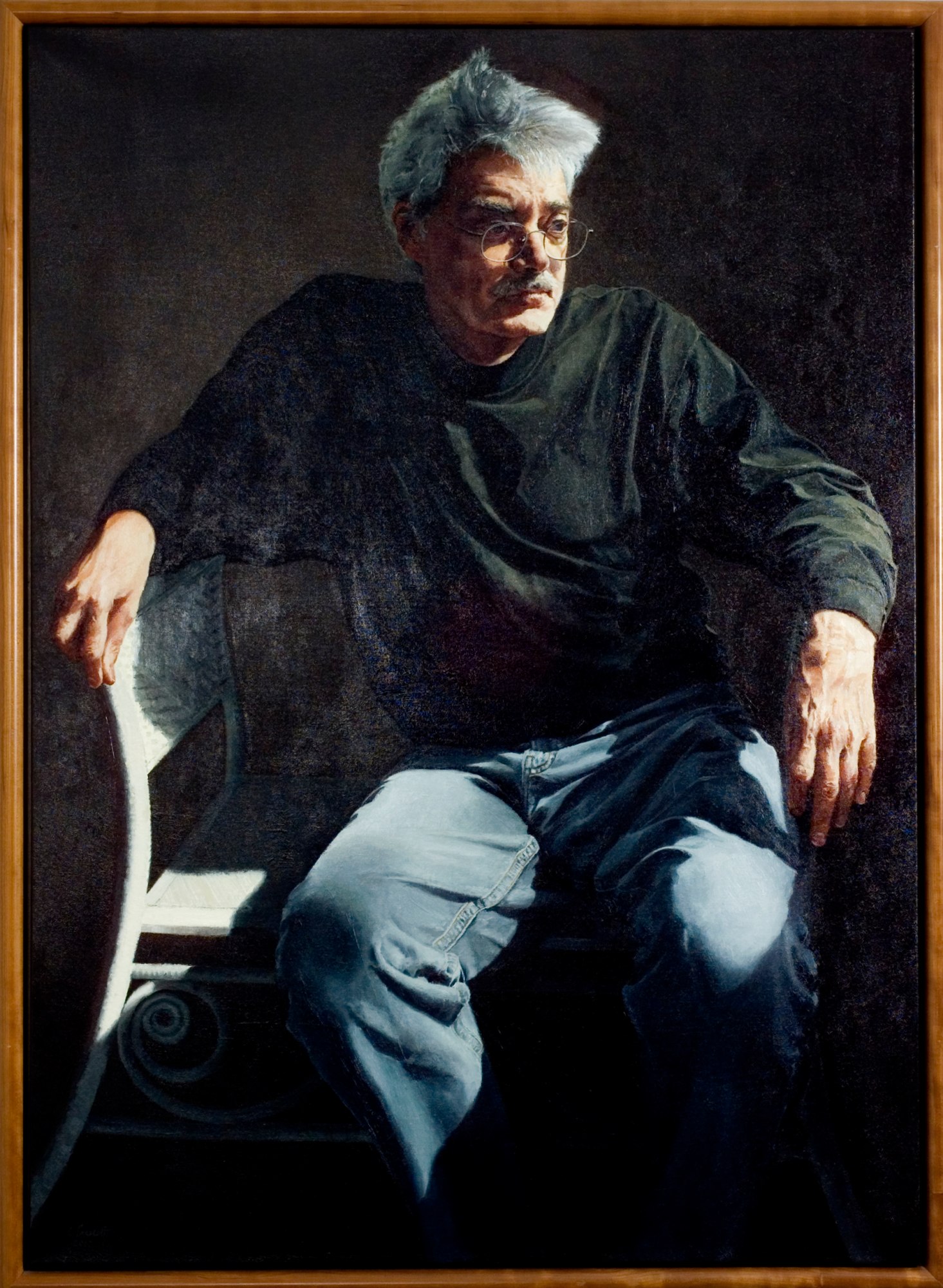 Message"The portrait Wild Bill came out of a friendship which developed as the result of my daughter, Grace’s, close relationship with Bill’s nephew, Kevin, during their high school years and until Kevin's death from cystic fibrosis in 2001. Bill is from Indiana, where he is a professor of English, and during his frequent visits to Kevin and his family the kids got us together to join in on their philosophical talks. We saw each other frequently, sometimes at the hospital, as Kevin got sicker and sicker, and the conversations took on more and more depth and weight. I painted them together in conversation in a large portrait entitled "Body and Mind: Kevin and Uncle Bill" in 2000. Bill taught Kevin to enjoy the life of the mind, and in the painting, Kevin is holding a book as light shines across his body and illuminates Bill's head. Bill was not aware of the pet name by which Kevin referred to him until after Kevin's death when all of his friends started calling him ‘Wild Bill.’ He loved it, and I wanted to paint him again, this time by himself, but with that attribute in mind."