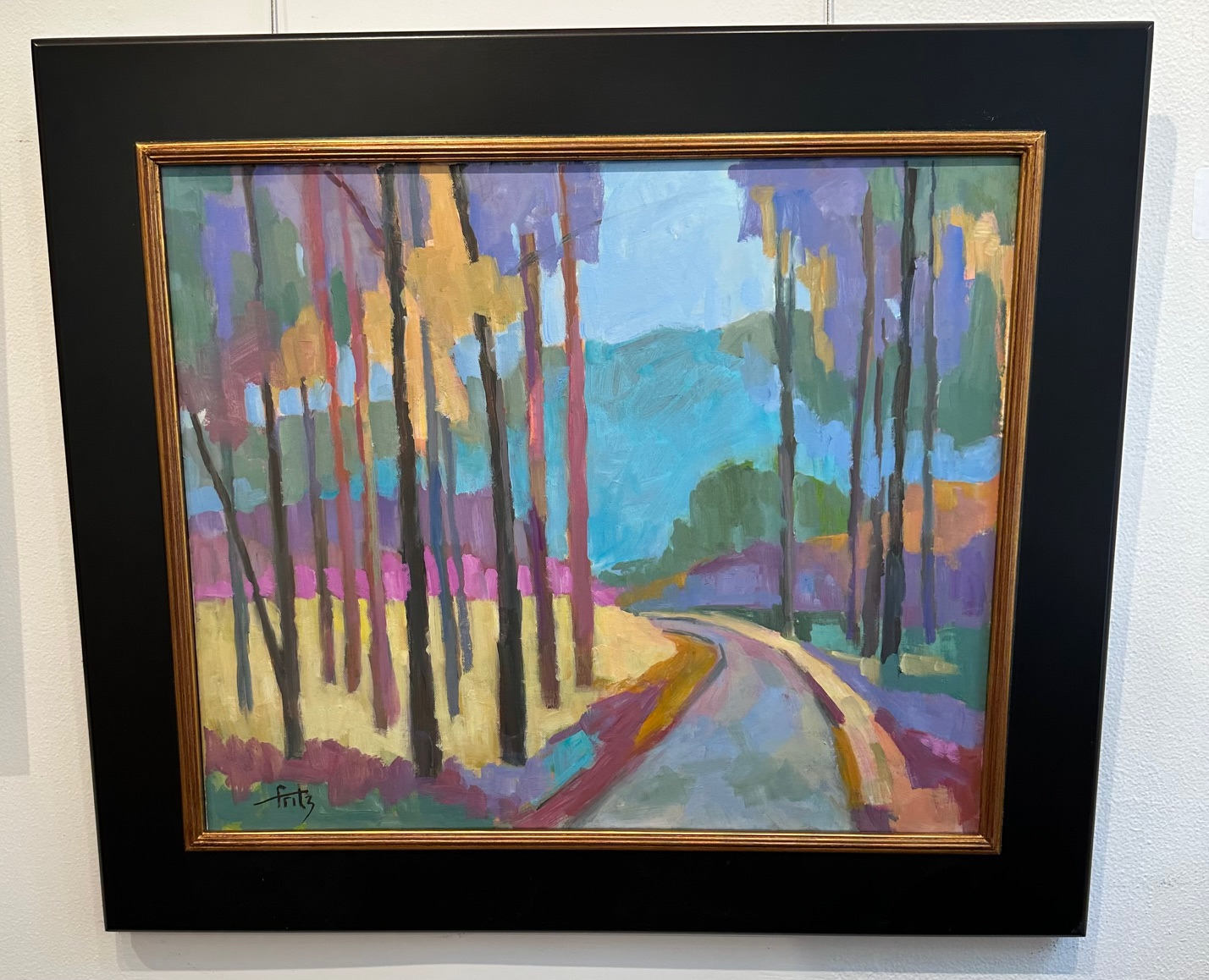 The atmospheric effect of a misty morning on Maryland’s Eastern Shore inspired this view of a Tred Avon River tributary with its characteristic meadows and tree copses, enriched with juicy color notes. Cold wax medium and palate knife contributed to this effort.