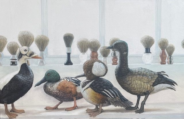 David decided to paint all the ducks that were up for the National Duck Stamp, as they were walking through a barber shop. There are the Brant, Northern Shoveler, Greater Eider, Spectacled Eider, and the Hooded Merganser. Badgers is French for shaving brushes. ( un blaireau )