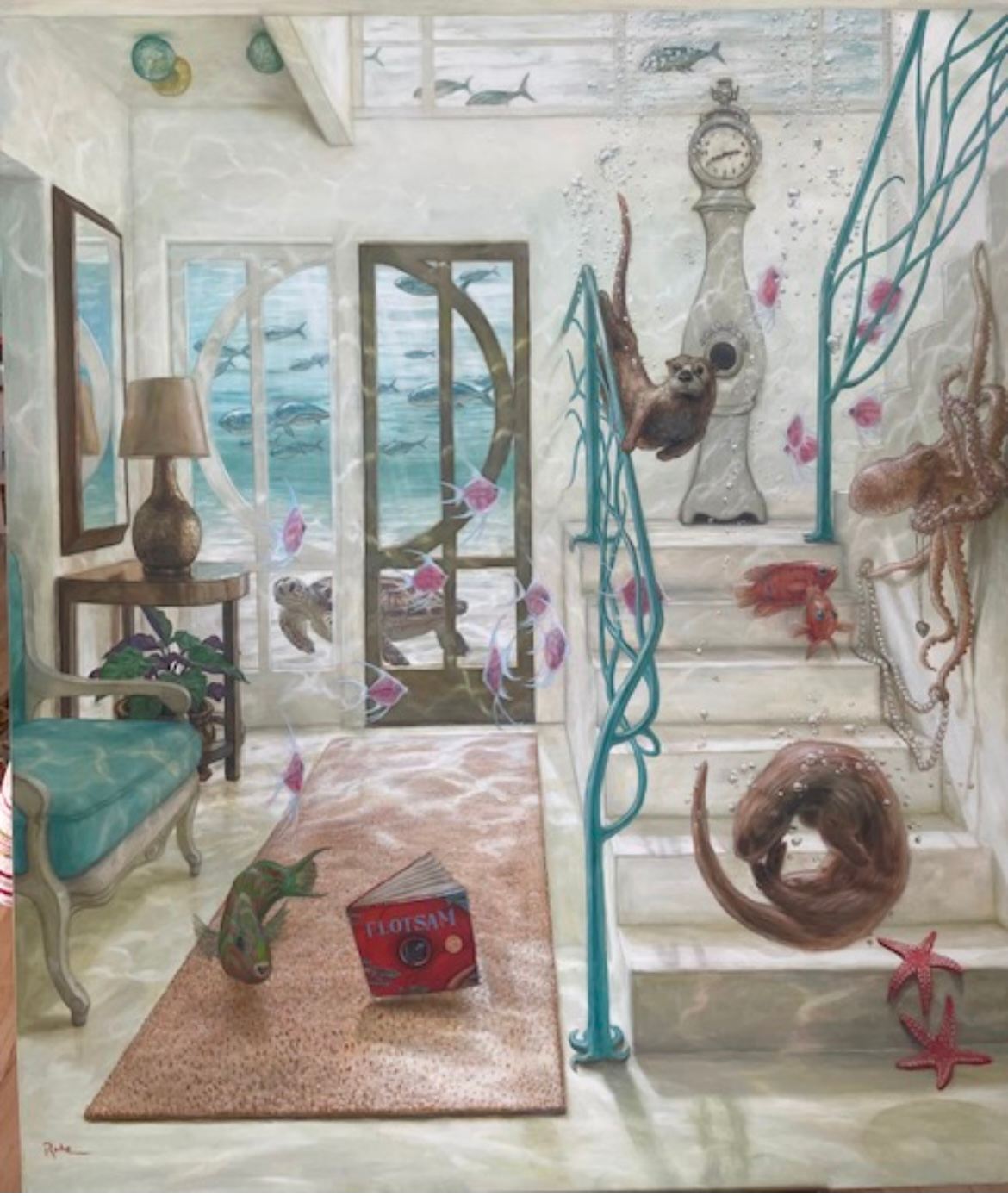 “Flotsam” depicts our life story. For the last 30 years we have lived and worked on Sanibel Island. Hurricane Ian, changed all that and the lives of everyone on the Island. Nothing was untouched. We lost our apartment, David his studio and gallery representation. We evacuated the day before to our daughter and her husband on the east coast with our new kitten, Bruno. No Islander’s could return for a month, as the causeway was taken out by the storm. When we returned, we found that an 8 foot storm surge had filled the apartment, everything was lost. But we found magic too, All the love letters we’d written to each other were dry. All my Great Grandmother’s china, intact. All the shell mask I make and placed on top our bed never got wet, they had floated on the mattress to the ceiling!