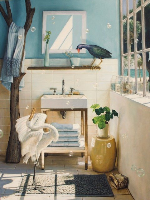 “Perched Perfect” Is a lovely lotus pond with a very small bird sitting on top of a lotus bud. The lighting is brilliant. This painting has almost an abstract feel to it. Again, you can see the love David has for lighting.
