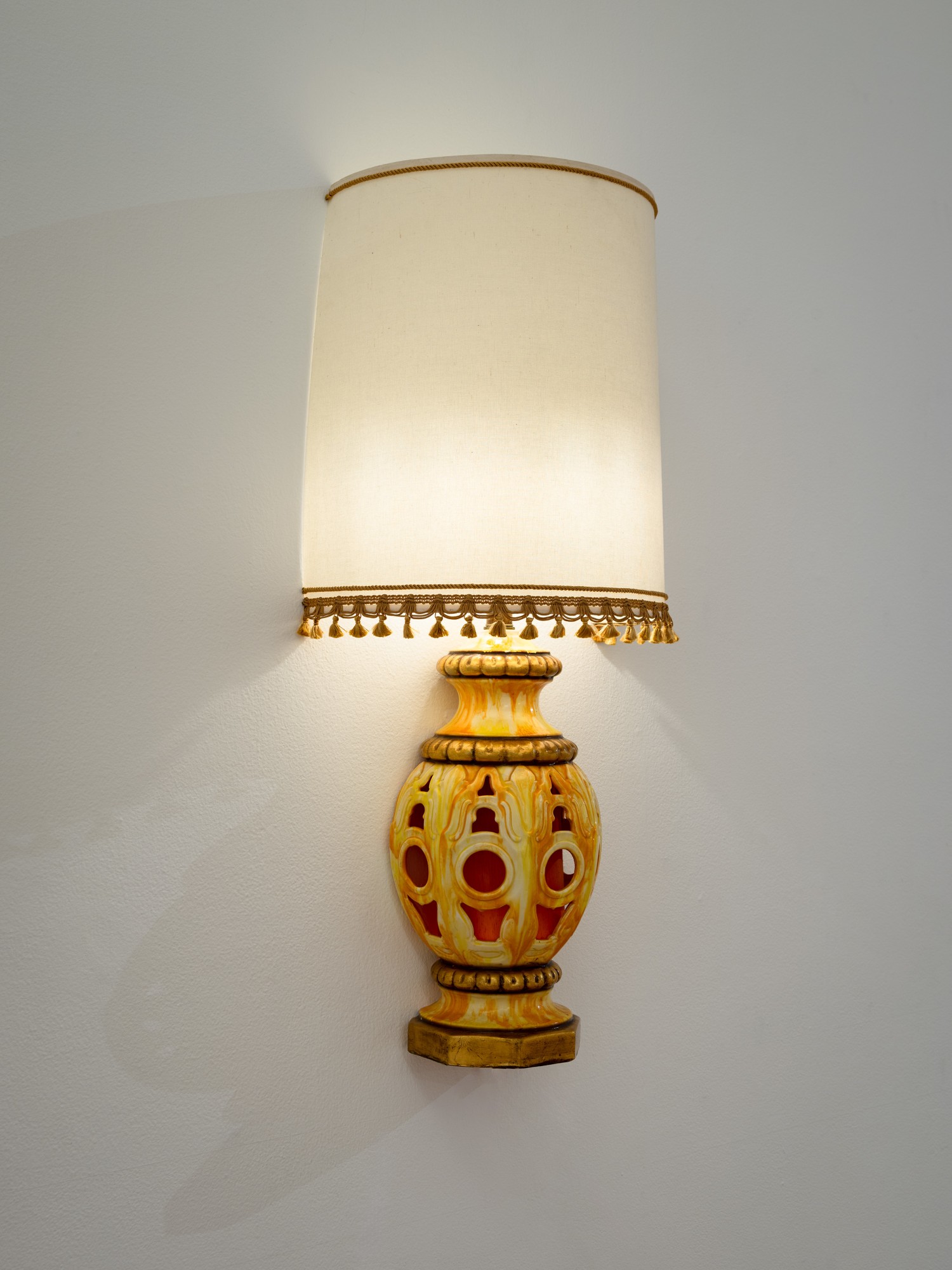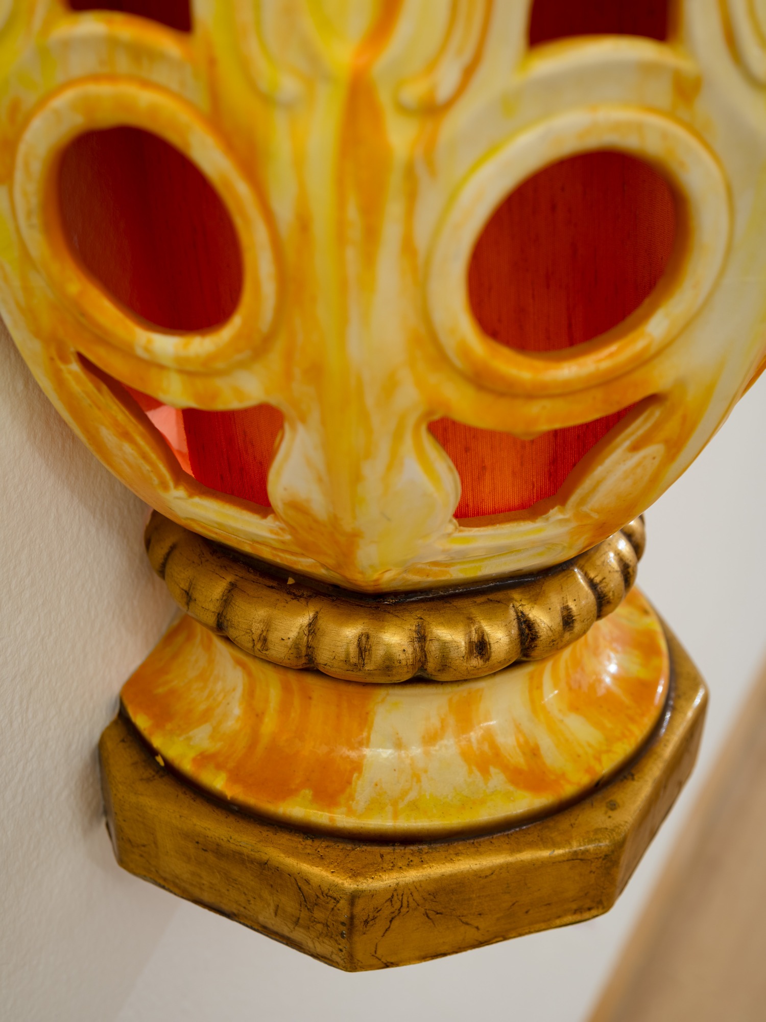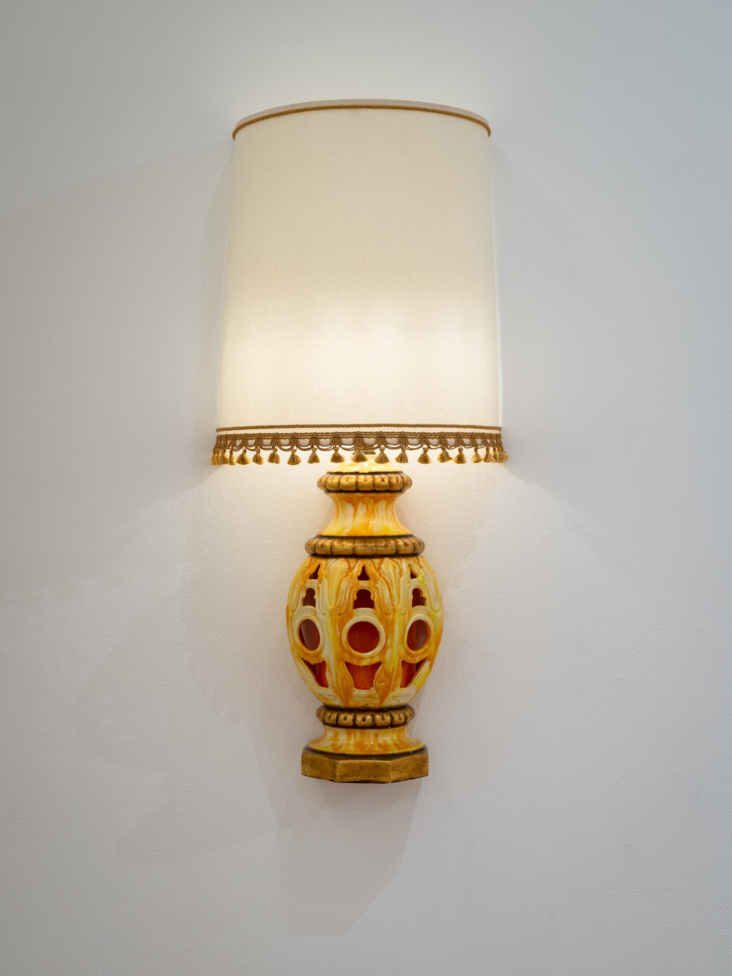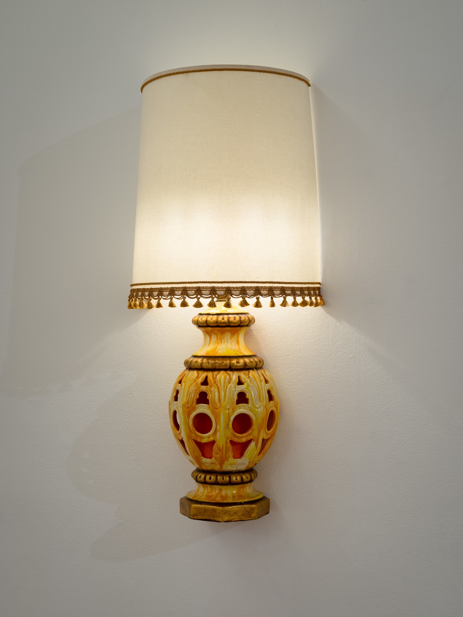 This lamp was actually cut in half and mounted on the wall to give a relief, or raised from the wall, effect. Roman de Salvo likes to take ordinary, domestic objects and transform them into something different and more exciting. He transforms this bulky and space-occupying object into something that can stand on its own, as well as giving the room a more eccentric and humorous feel. Roman explores double meanings and wordplay in his work, as the act of hanging the lamp on the wall “relieves” the table of having to support it. He essentially creates a relief sculpture that relieves another object of its duty. Another double meaning in this piece can be seen as he takes an object that was already in the home to display as an art piece, which then in turn can be bought and put back into the home.