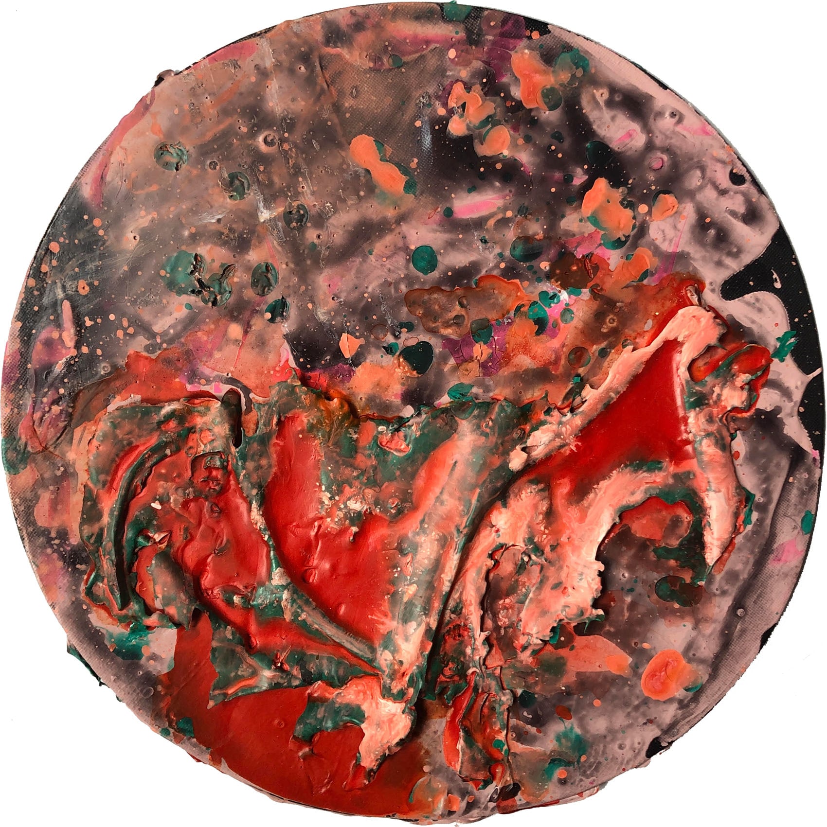 Diptych circles 12" each on canvas board. Acrylic on canvas board with heavy multi-layered brushstrokes. Framed in natural mdf frame 14”x14”.