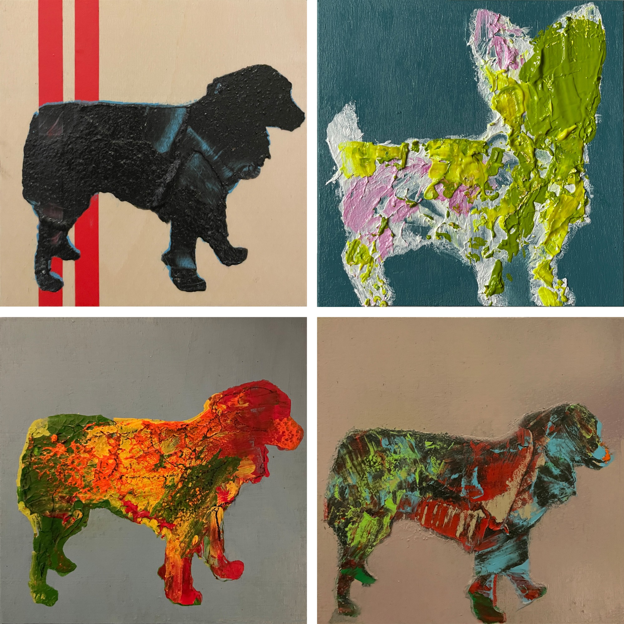 Dog as man's best friend. These beloved pets big and small love us as much as we love them. They are part of the family. Capturing the essence of a Yorkie and an Aussie, the artist uses color and texture to depict different dog breeds. Acrylic on wood. Ready to hang on cradled wood.