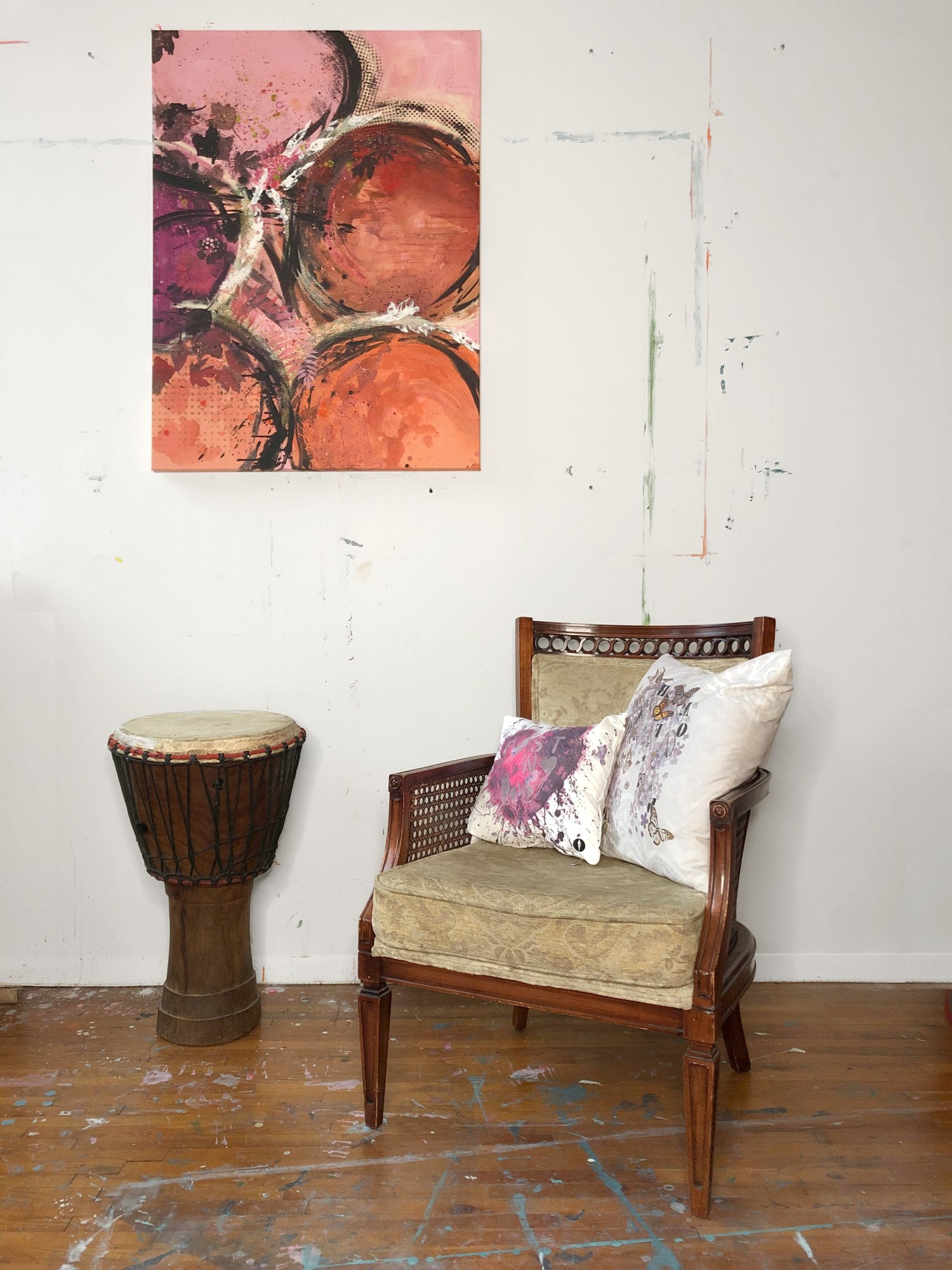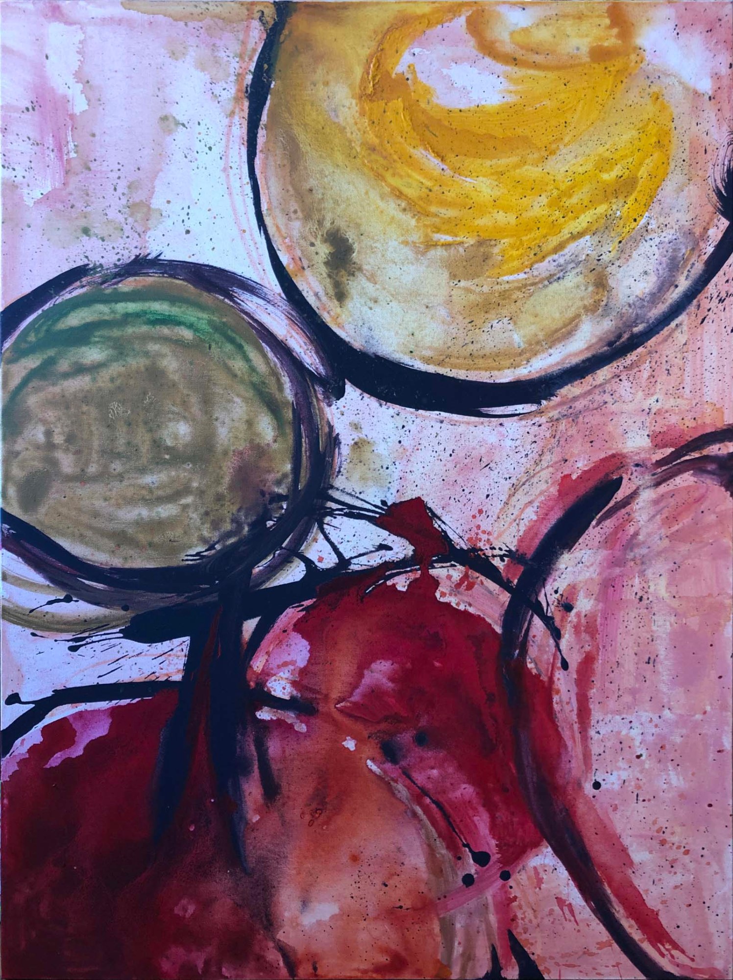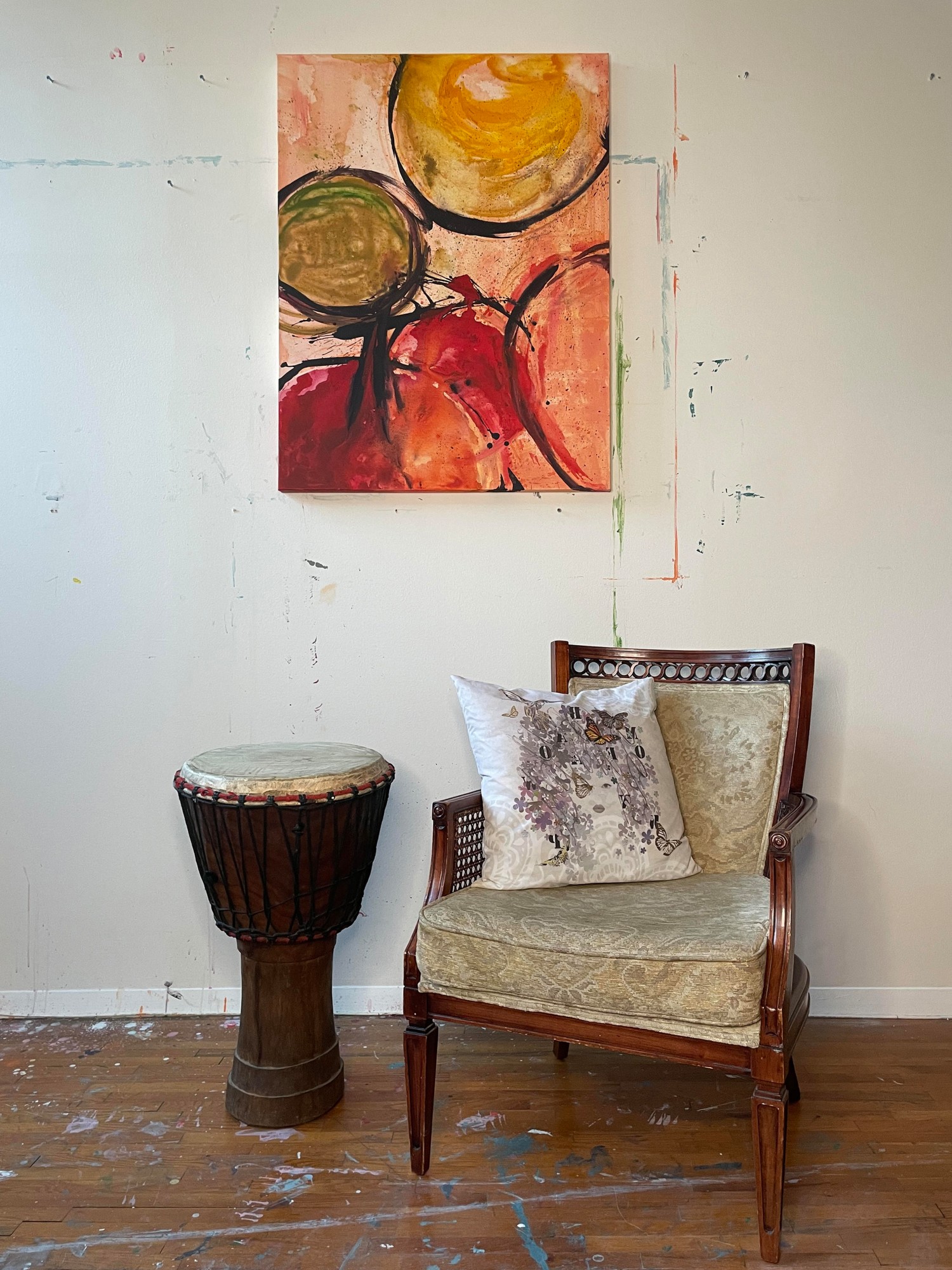 Inspired by graffiti, dance and poetry, this colorful abstract work is created by writing positive messages on the background color of the canvas, that are then blent in, covered or abstracted as different layers are applied on the painting. The paintbrush strokes are created with movements similar to dance. Happy, positive thoughts, translated into rich, autumn colors. The artist is depicting her fragmented childhood memories of autumns past; focusing on the brilliantly changing colors of leaves, bright sun and perfect weather of a Mediterranean fall. Meant to work on both vertical and horizontal orientation. Has light texture in different parts and painted sides. Varnished. Ready to hang on stretched canvas. Signed. Comes with Certificate of Authenticity.