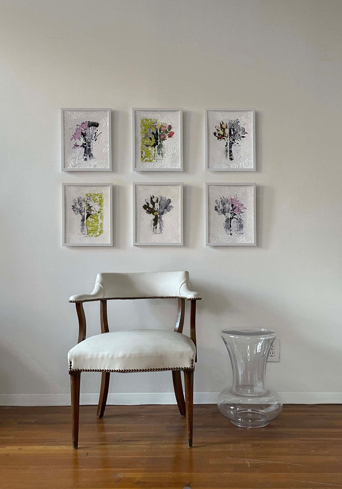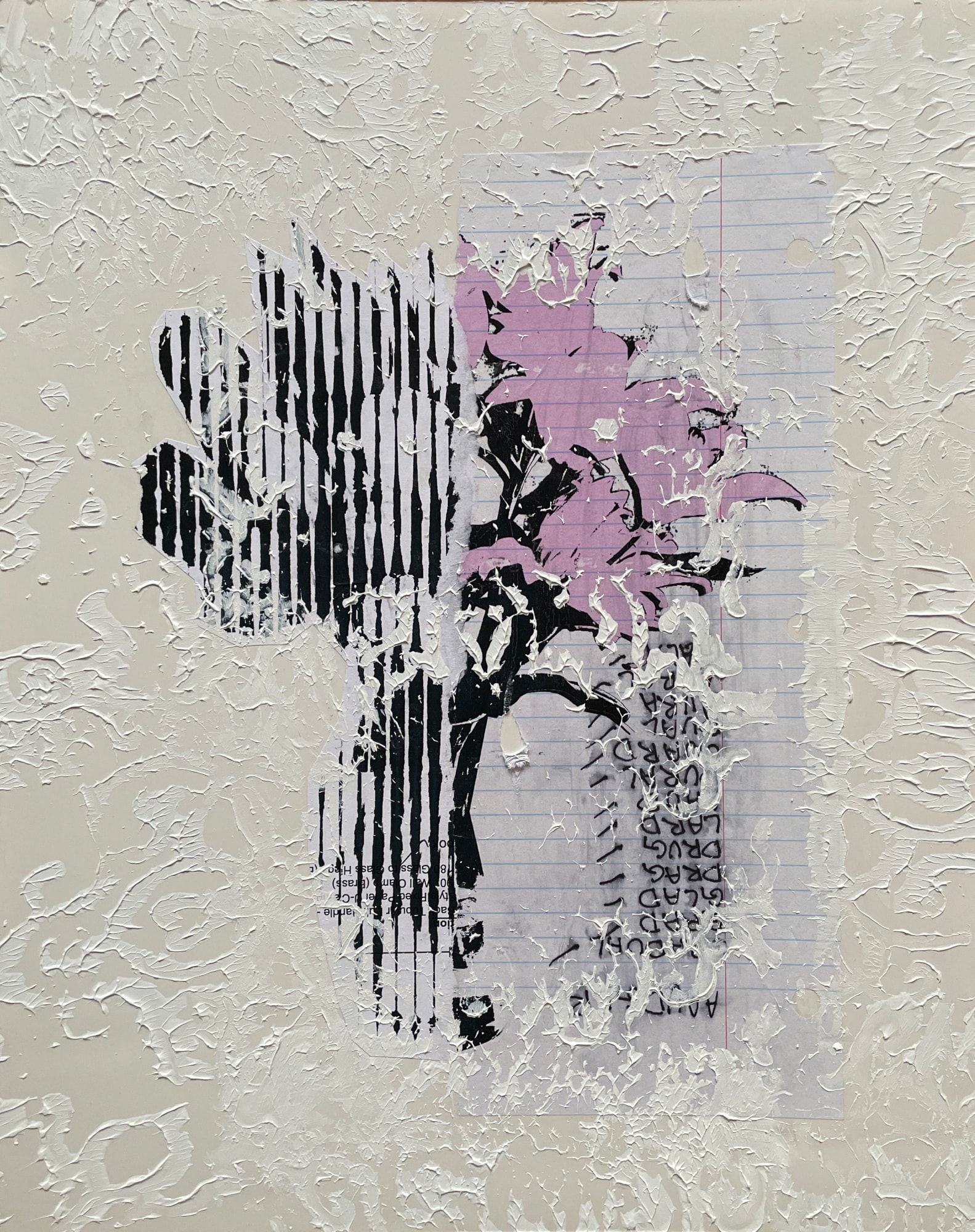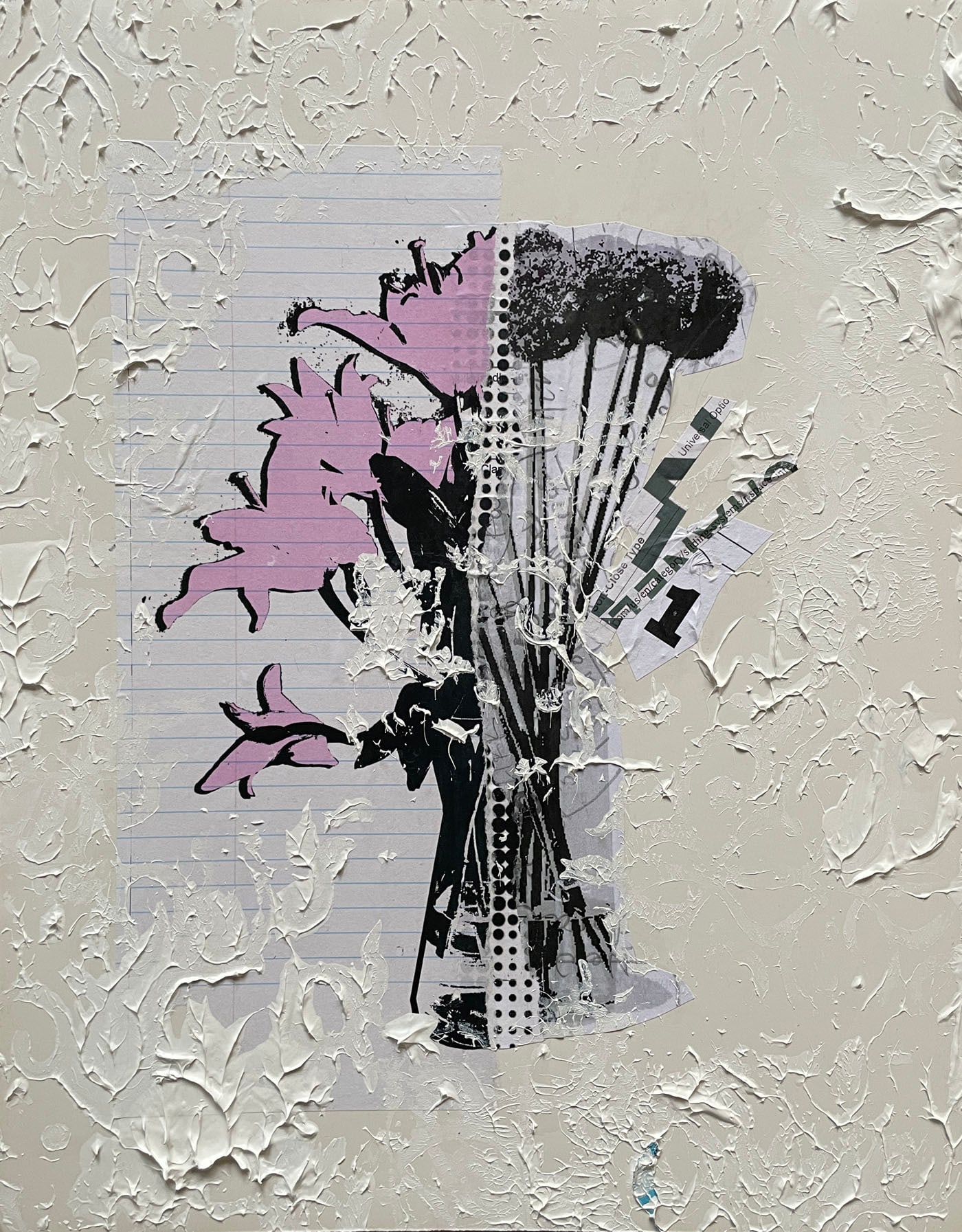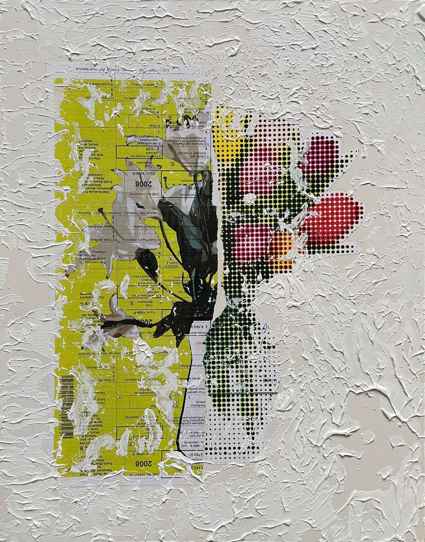 More and more I have trouble recognizing the digital version of people and their lives. Everything is filtered, optimized, enhanced, auto-corrected. Everyone looks like on the set of the movie Surrogates posting as humanoid remote-controlled robots. Floral Bouquet is an Exploration of our current duality, our digital lives vs our real ones. Insta accounts full of glamour, filtered selfies and pictured perfect lives as opposed to the reality of things. Digitally manipulated imagery is printed on carefully sourced upcycled paper, then ripped in half and paired with a different image to create a whole. Partially painting over the imagery to add a two tone effect and texture. On foam core board ready for framing.