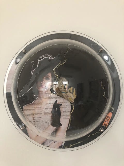 Mixed Media: upcycled paper with images sourced from magazines, etc, acrylic, chalk, coffee grounds,dry cleaner’s tag and silk petals with papier-mache butterfly. Encased in acrylic dome.