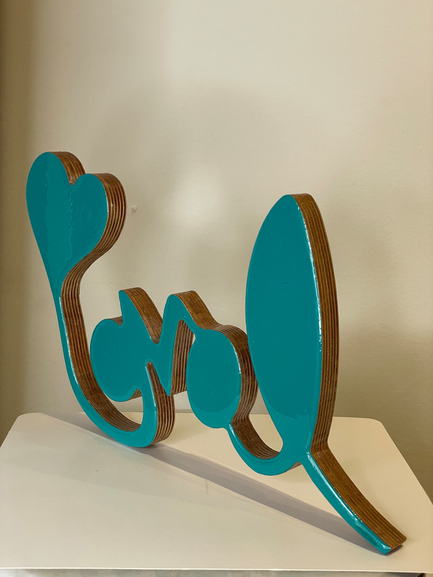 A continuation of the artist's Love themed mixed media, exploring the notion of love in the 21st century, in the age of social media and dating sites. In 2021, after an intense and challenging year, we need more than ever a positive confirmation as a reminder of everything good. What better affirmation than love itself; love for ourselves, our planet and for one another. What do you love the most? Have a constant reminder of your love with this very pleasant artwork. This wood sculpture is hand-painted, varnished and coated with multiple layers of resin for a super high gloss, candy-like effect. Signed. Place it on a desk, table or fireplace mantle, or hang it on the wall.