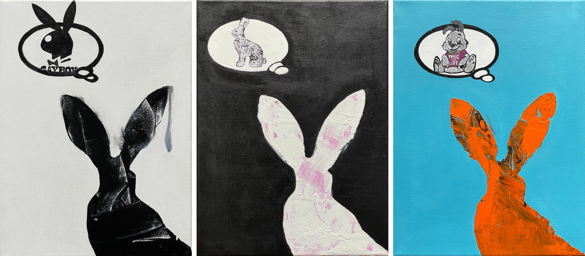 This minimalistic piece pays tribute to famous artist bunnies and is made with acrylic on canvas and comes in different color combinations that work well individually or as a set. Ready to hang on stretched canvas.