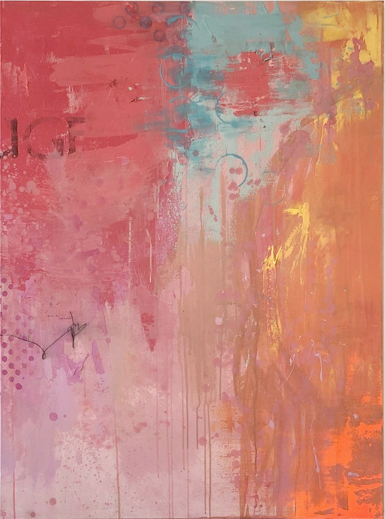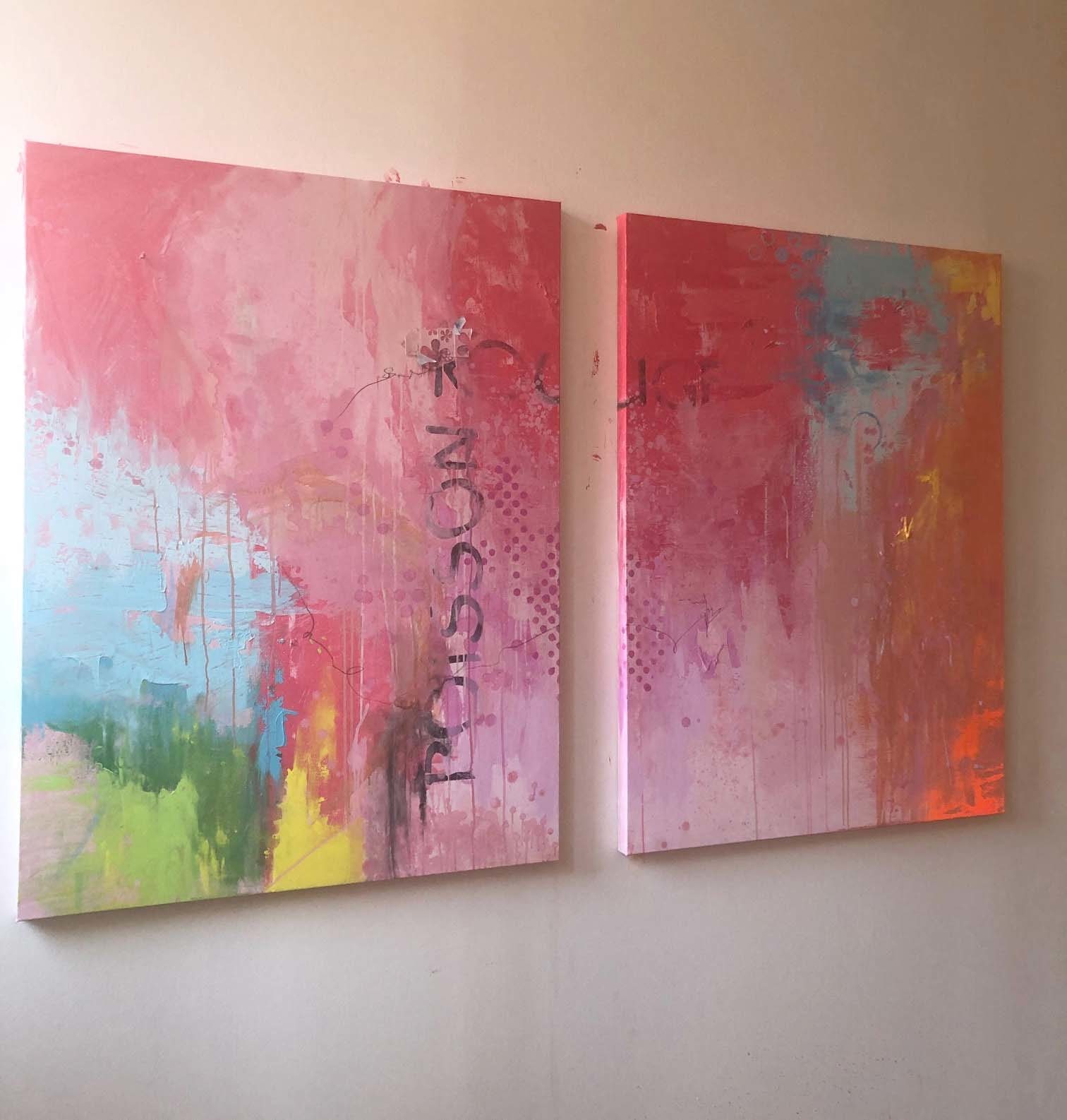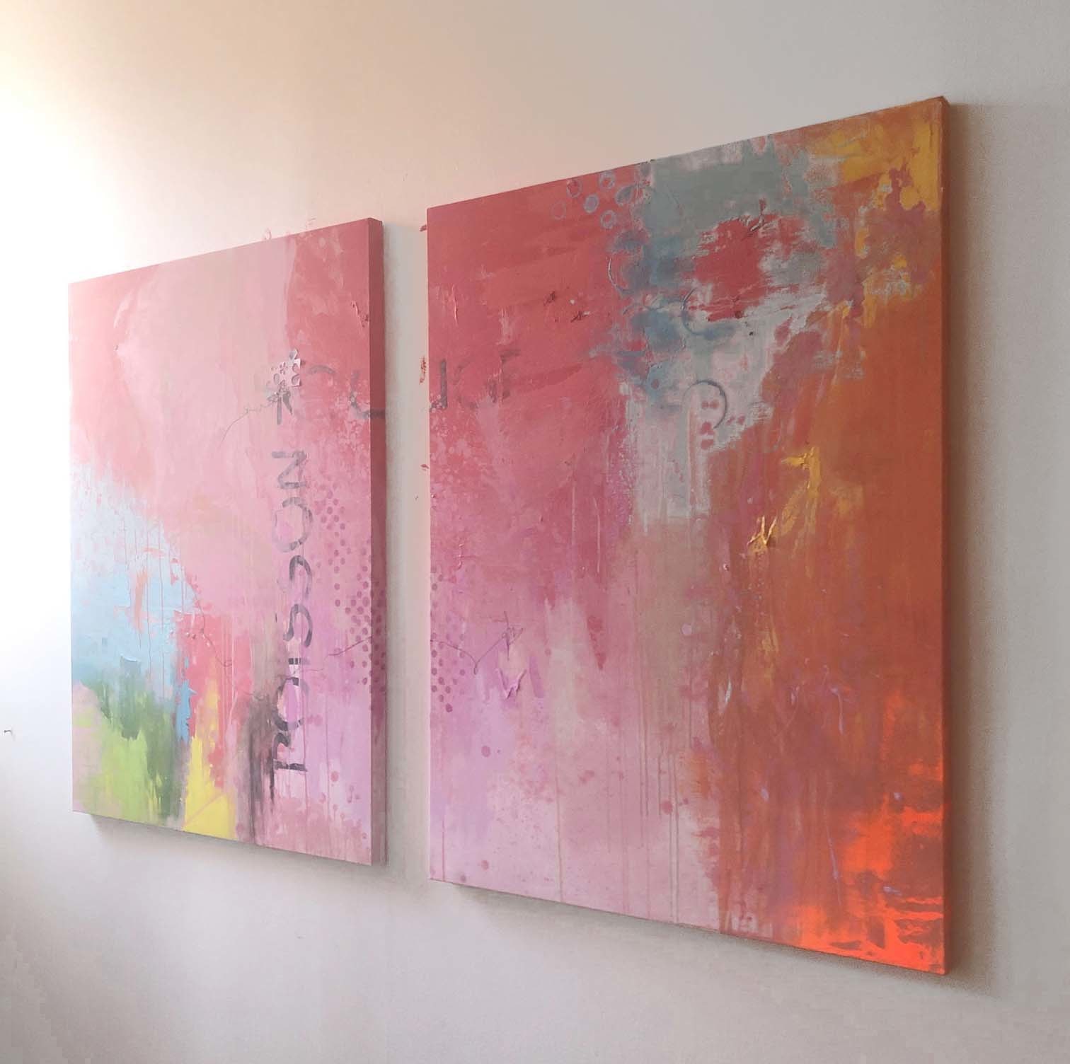 Inspired by graffiti, dance and poetry, this work is created by writing positive messages on the background color of the canvas, that are then blent in, covered or abstracted as different layers are applied on the painting. The paint brush strokes are created with movements similar to dance. Happy thoughts. Happy, bright colors. Meant to work on both vertical and horizontal orientation as well as as a diptych, with or without gap in between. Has texture in different parts and the left panel has tape and paper in one spot. Finished sides. Varnished. Ready to hang. Signed. Comes with Certificate of Authenticity.