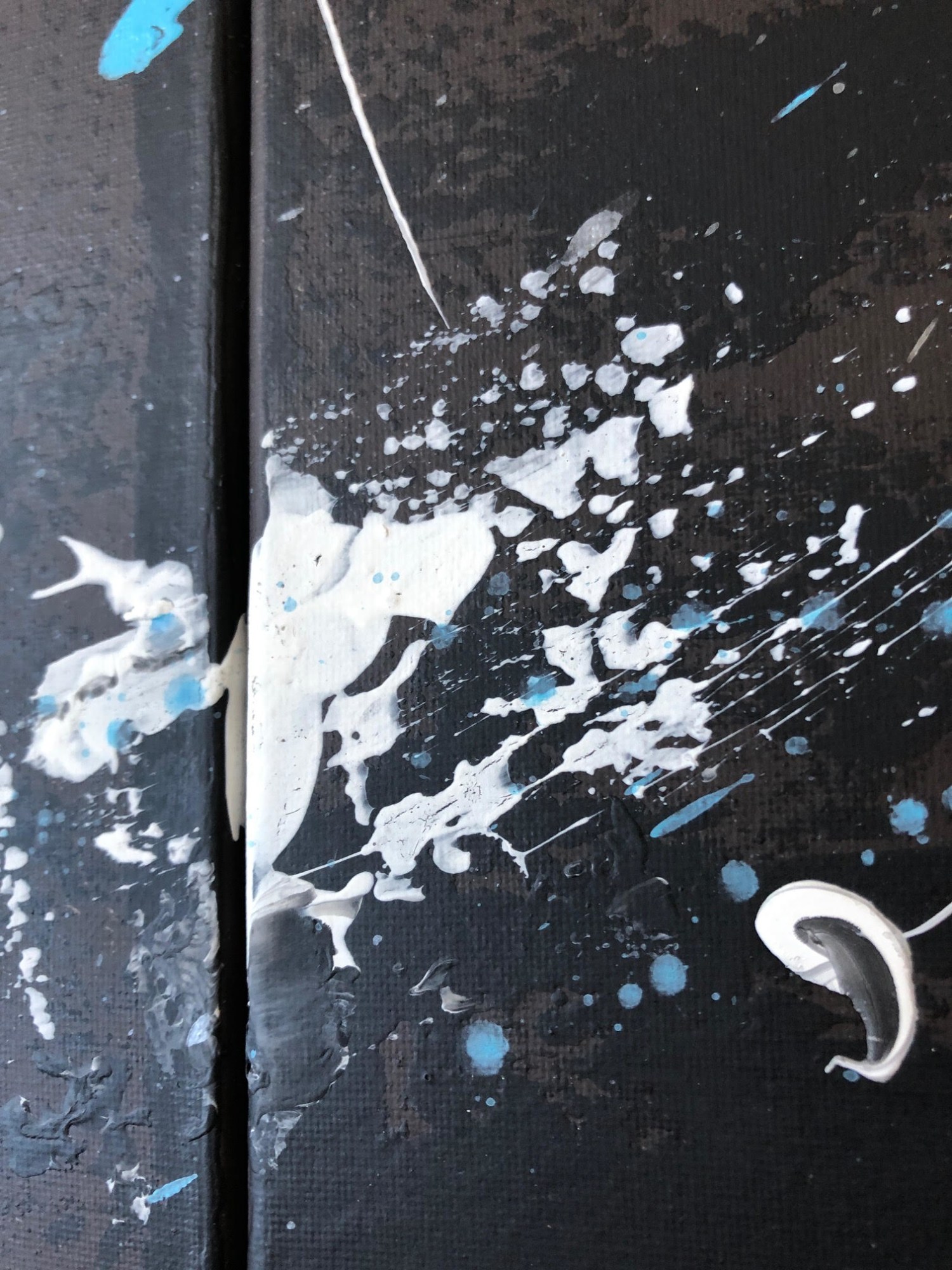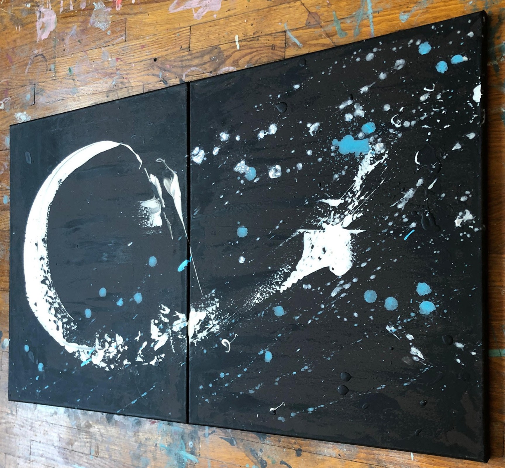 This body of work explores recurring layers of memory and reflections on time while engaging the viewer in a playful array of color and shape, allowing for their own particular associations to come through. Inspired by the universe and childhood dreams of space travel as commercial trips to the International Space Station would soon become a reality. Acrylic on canvas. Diptych on 2 panels that are meant to work well both on a horizontal and vertical orientation. Sides are painted. Signed.