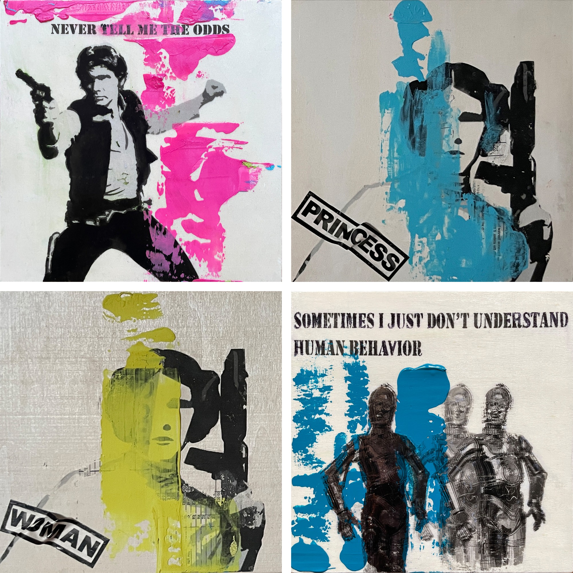 Beloved Carrie Fisher and a favorite childhood hero, Princess Leia of Star Wars, the ultimate Girl Power Symbol. This is a retake on a larger scale Mixed Media piece. Han Solo, C-3PO.