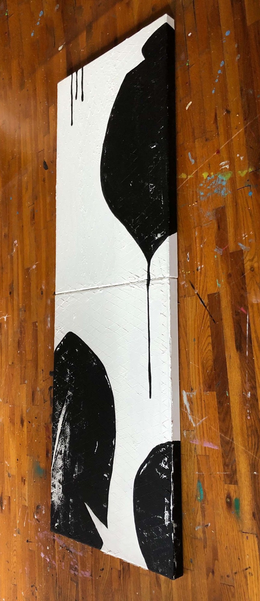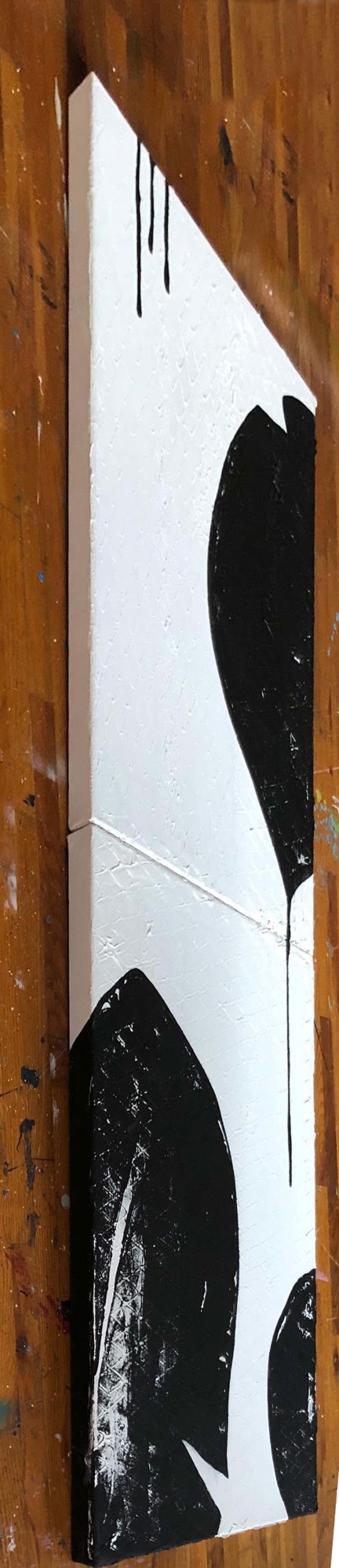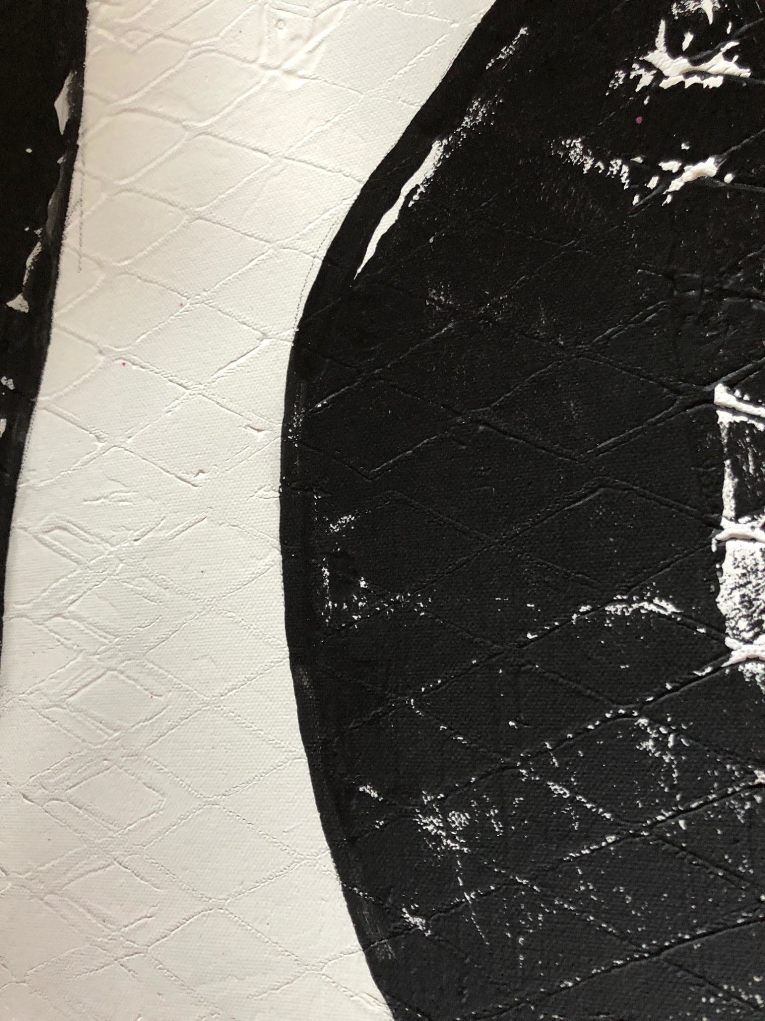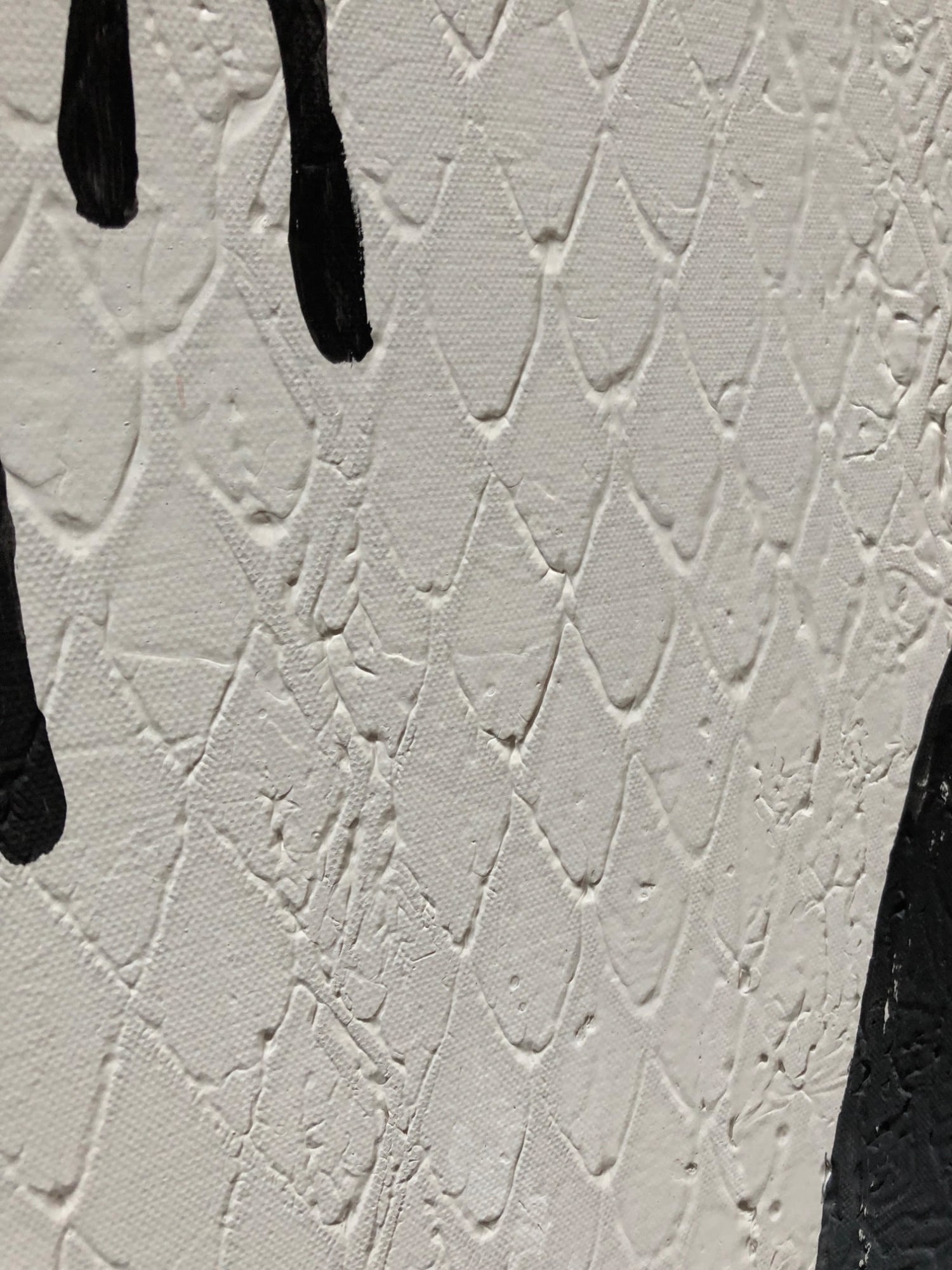 A modern, minimalist composition in black and white, Has a geometric texture throughout. Sides are painted for a finished look. Coated with varnish.