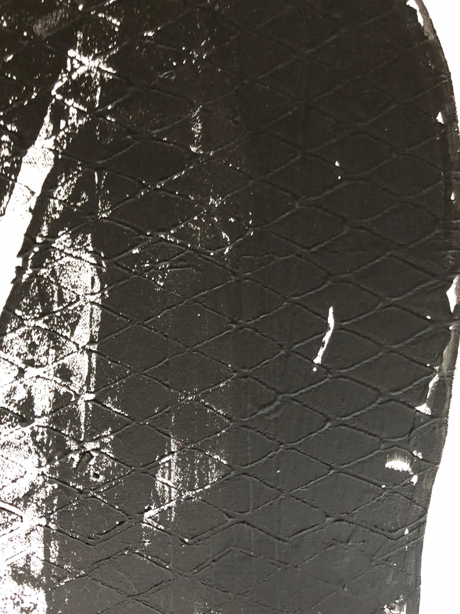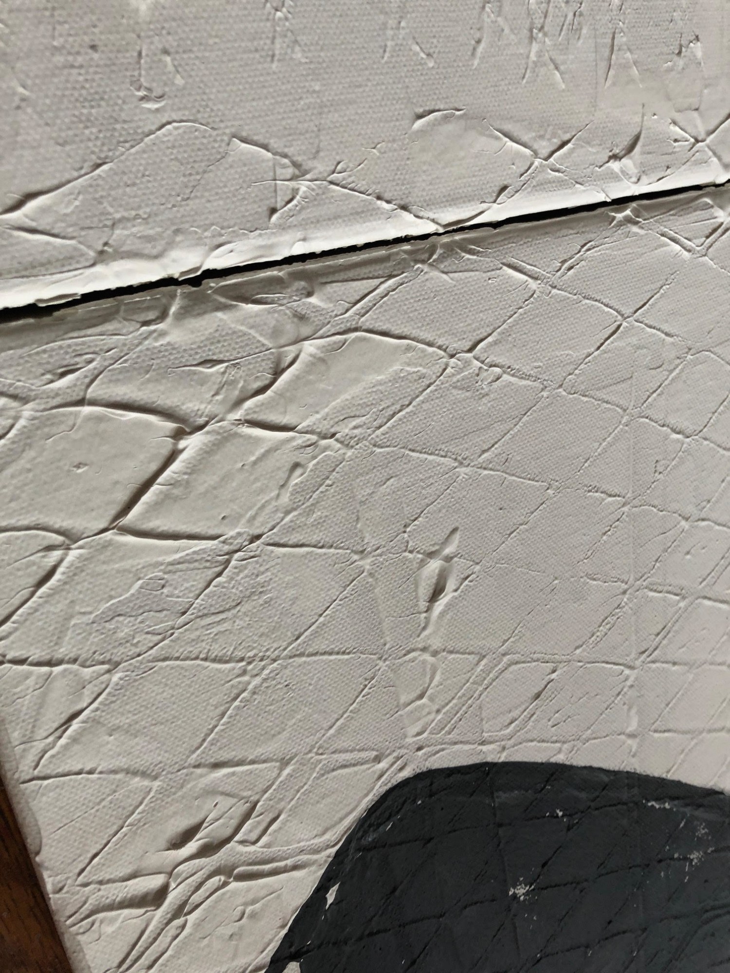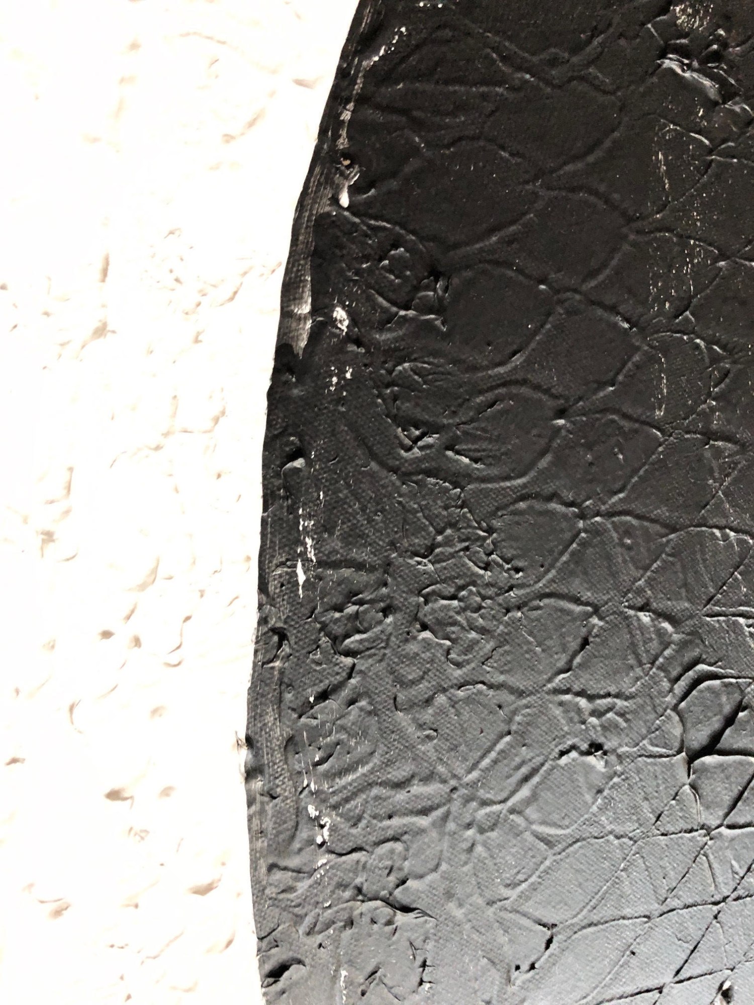 A modern, minimalist composition in black and white, Has a geometric texture throughout. Sides are painted for a finished look. Coated with varnish.