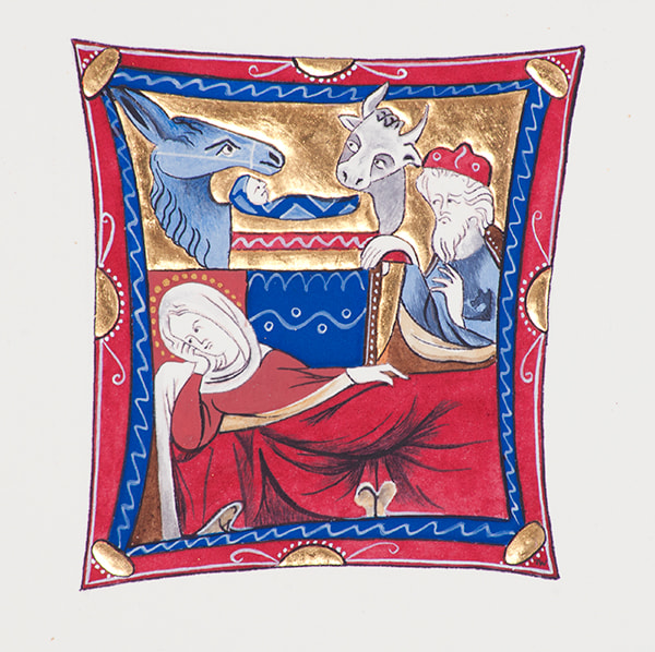 This scene was adapted from a nativity in Thomas Aquinas’s Golden Chain, dating to the fourteenth century and thought, originally, to have been made in Oxford. The manuscript is now held in Durham Cathedral. This particular arrangement of figures was seen commonly in English art of the period.