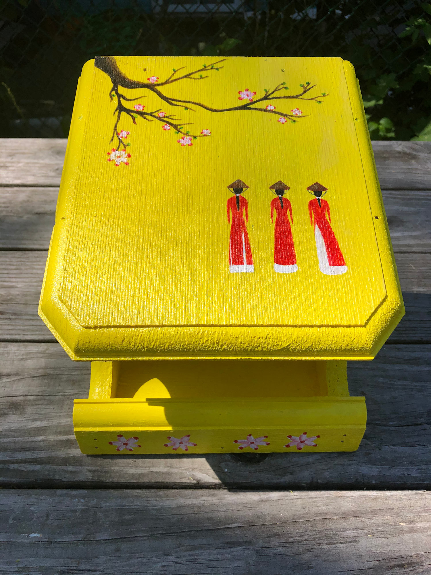 “Ba cô gái, three girls," 2020 oil on canvas 48x60”, 2016 Inspired by Vietnamese folklore and ghost stories, this work depicts the story that Vietnamese families often share of three girls journeying and in search of something.