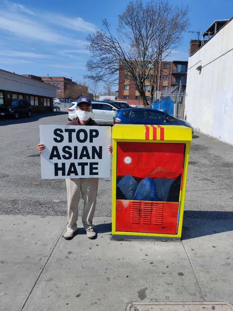 “My Activist Dad”, 20x15 ft, 2020 This is an image of my dad holding a Stop Asian Hate protest sign right next to my painted utility box in 2020. I wanted to showcase the importance of my dad as a local resident speaking out for the Asian American community.